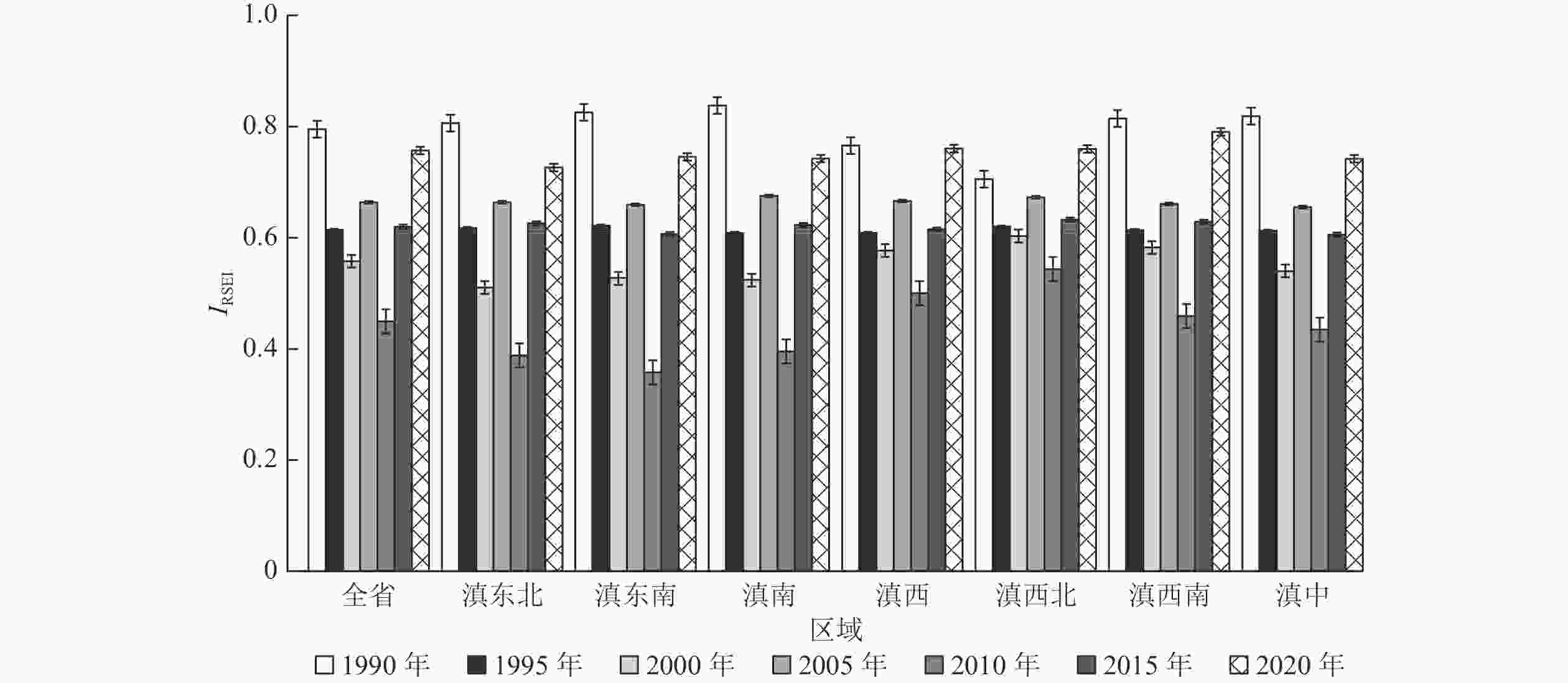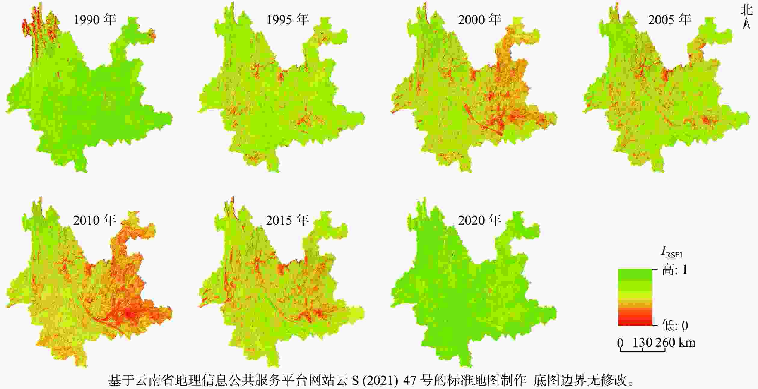 • 图1所示:遥感生态指数的计算结果可表征云南省1990—2020年生态质量的动态演变特征。相较于IRSEI不同生态条件下已有的测算结果而言[23],城市地区IRSEI为0.450~0.590,森林或植被茂盛的地区IRSEI高于0.630,但在土壤侵蚀严重地区IRSEI低至0.180,在沙漠地区IRSEI则低至0.240,可以更好地横向比较云南省生态质量的具体情况。1990年,滇东北、滇东南、滇南、滇西南以及滇中的大部分地区生态质量均达到了优良等级,IRSEI达0.800以上,而滇西、滇西北的高寒山区明显低于省平均水平。之后,随着人口增多导使土地依附性增强,再加上陡坡开荒、过度垦殖、顺坡耕种等不合理的开垦耕作方式,能源获取以及对森林的乱砍乱伐等[24],至2000年全域生态质量普遍下降,IRSEI省均值从1990年的0.795下降到2000年的0.558。随着退耕还林还草、集体林权制度改革以及石漠化综合治理等生态工程的陆续实施[24],2005年生态质量得到初步恢复,IRSEI省均值达0.664。2009—2011年连续3 a干旱导致云南曲靖珠江源石漠化面积持续扩展,滇东北、滇东南、滇南地区生态质量普遍下降,IRSEI地区均值跌至0.400以下,其他地区也受到影响。2010年以后,随着城镇化进程及生态修复政策的实施,IRSEI省均值从2010年0.449上升到2020年的0.757,平均每年增长6.86%。