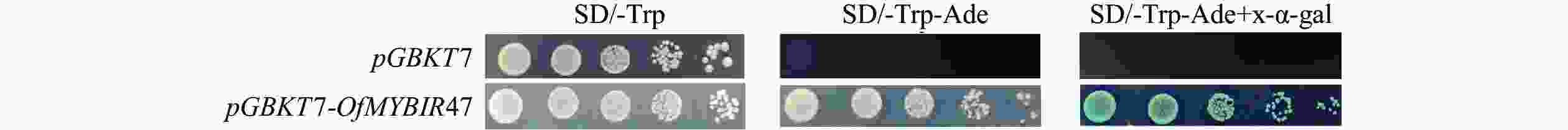 此外,利用EcoRISmaI限制性酶切位点,将缺失终止密码子的OfMYB1R47基因的CDS区域连接到pGBKT7载体上。然后使用酵母菌株AH109 (上海唯地)获得pGBKT7-OfMMB1R47和pGBKT7载体。最后经PCR阳性检测后,挑取阳性克隆的单菌落在选择性培养基SD/-Trp、SD/-Trp-Ade和SD/-Trp-Ade+X-α-gal中黑暗培养3 d,在恒温培养箱(30 ℃)中观察目的基因是否具有自激活活性。