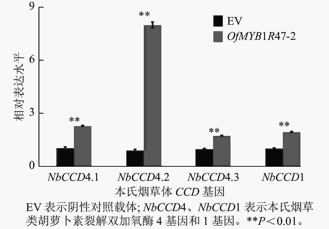 基于OPLS-DA分析,通过筛选VIP>1和P<0.05的差异物质,发现与瞬时表达空载体相比,OfMYB1R47瞬时表达植株中辛醛和β-紫罗兰酮的相对含量都发生了显著改变(表2图6D)。从GC-MS的峰面积来看,OfMYB1R47瞬时表达植株中,辛醛的面积明显比对照瞬时表达植株小,表现为辛醛的相对含量显著下降;而β-紫罗兰酮的面积明显比对照瞬时表达植株大,表现为β-紫罗兰酮的相对含量明显上升(图6E)。此外,RT-qPCR结果显示:与瞬时表达空载体植株相比,在瞬时表达OfMYB1R47-2植株中NbCCD4.1、NbCCD4.2、NbCCD4.3以及NbCCD1等与β-紫罗兰酮合成相关的酶基因的表达量都显著上升(图7)。