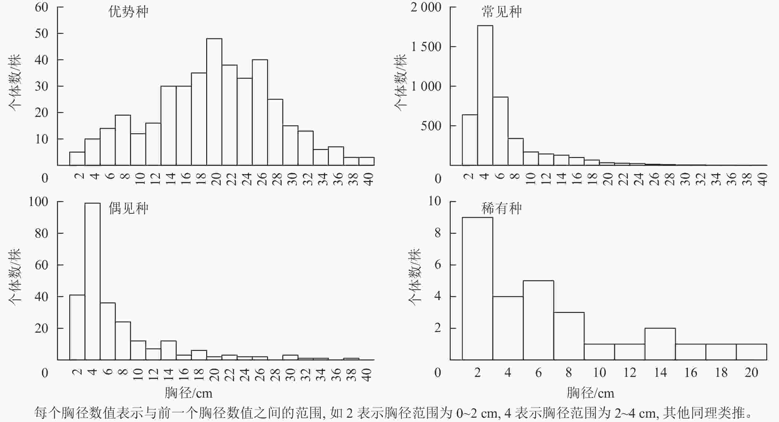 以往研究将1 hm2内个体数≤1株的物种定义为稀有种,>1株且≤10株的物种为偶见种,>10株的物种称为常见种[18]。由于优势种通常对群落内的其他物种产生较大影响,本研究把样地内重要值最大的物种——木荷Schima superba从常见种中独立出来作为优势种,然后对优势种、常见种、偶见种与稀有种之间的关系和差异进行研究。