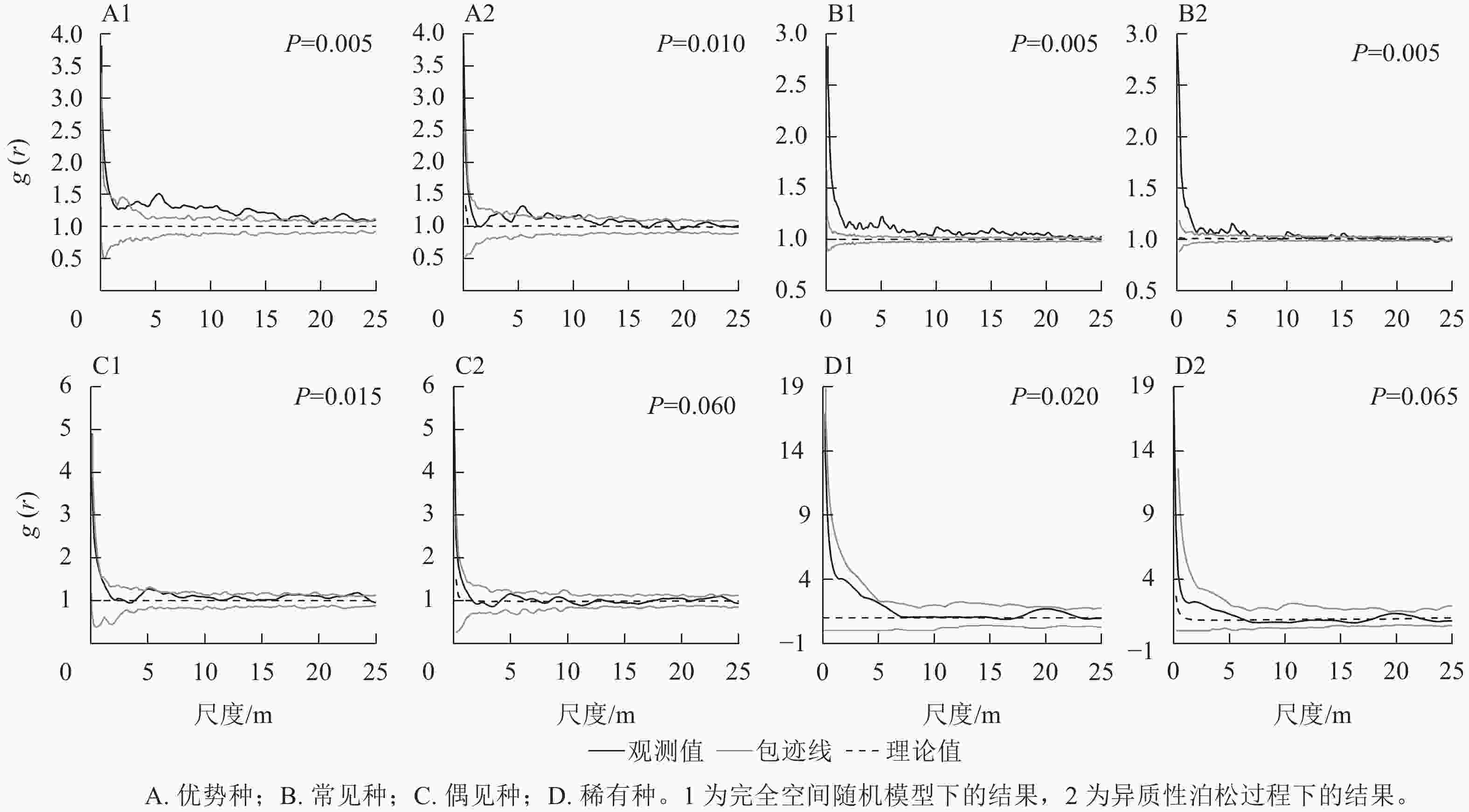 如图2所示:在完全空间随机模型下,除了稀有种类群,其他3个类群均表现出聚集分布;在排除生境异质性后,优势种在<10 m的大多数尺度上以聚集分布为主,在>10 m的尺度上变为均匀分布;常见种在大多数尺度上表现为聚集分布,偶见种和稀有种均表现为随机分布。拟合优度检验结果(图2)显示:所有类群的空间格局在0~25 m的尺度上均显著偏离完全空间随机模型,表现为聚集分布;在异质性泊松过程下,优势种和常见种显著偏离模型,表现为聚集分布,而偶见种和稀有种符合模型,表现为随机分布。