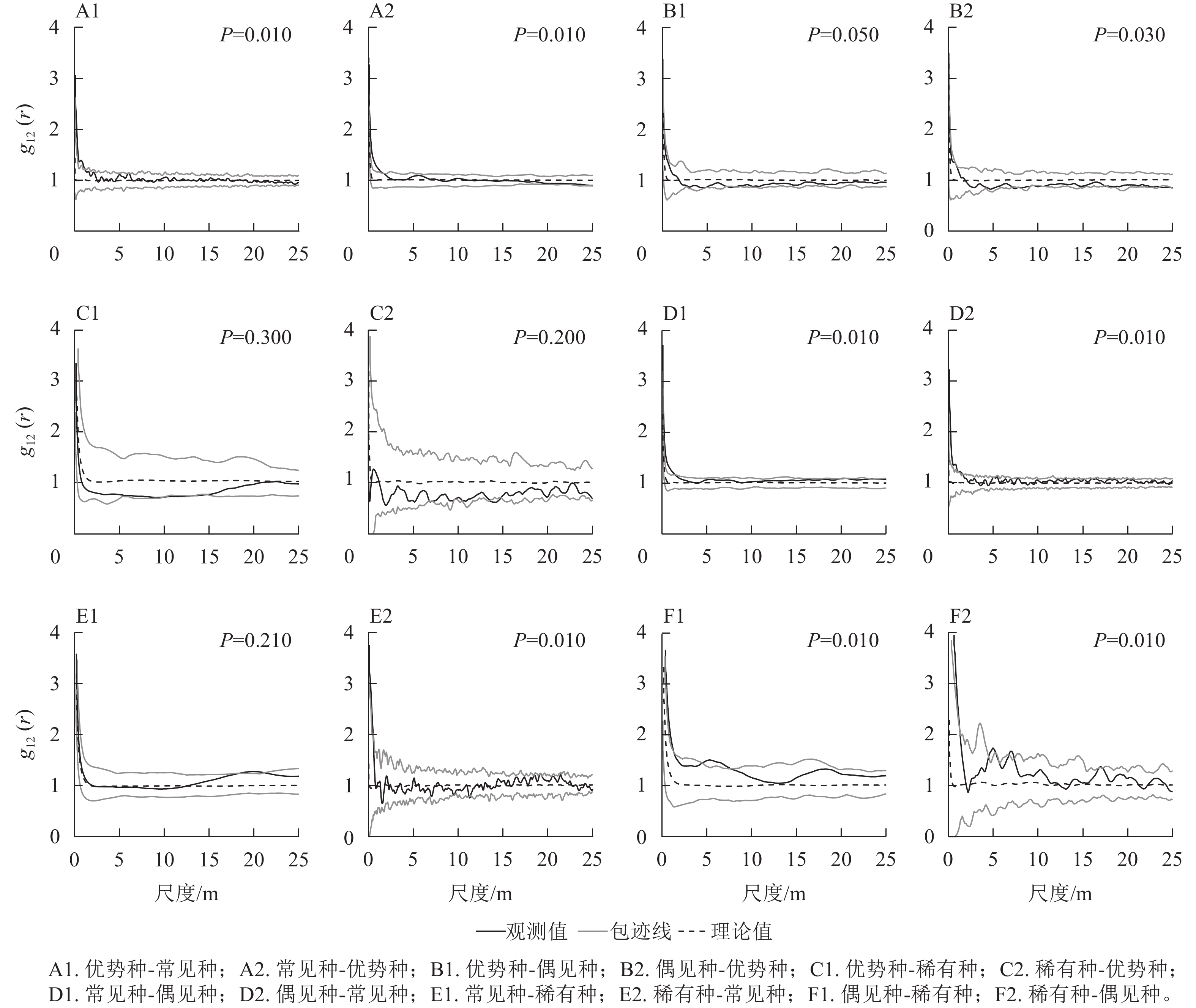通过199次Monte Carlo随机模拟计算99%的置信区间,当某一尺度上的函数值高于上包迹线表示该类群在该尺度上为聚集分布或2种类群间存在显著正相关,低于下包迹线表示该类群在该尺度上为均匀分布或2种类群间存在显著负相关,在上下包迹线之间表示该类群在该尺度上为随机分布或2种类群间无显著相关[22]。拟合优度检验用于检验模型对实际格局的拟合能力。计算0~25 m尺度内观测值和理论值的离差平方和,用秩检验检测模型的显著性,当观测值的秩<5或>195时,说明观测值在P=0.05水平上显著偏离理论值[23]。