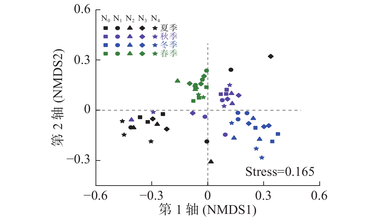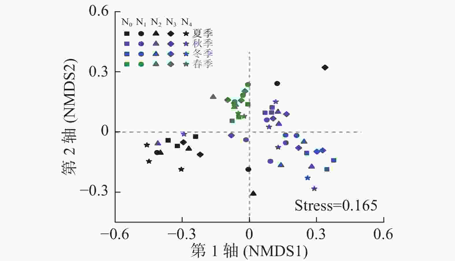 Archaeospora其他 夏季 N0 89.6±4.9 a 10.0±4.9 b 0.090±0.078 a 0.000±0.000 c 0.027±0.029 a 0.067±0.090 a 0.157±0.271 a N1 76.3±5.7 b 23.3±5.8 a 0.223±0.387 a 0.007±0.012 c 0.133±0.154 a 0.000±0.000 a 0.000±0.000 a N2 85.8±6.3 a 13.5±5.9 b 0.550±0.470 a 0.003±0.006 c 0.043±0.006 a 0.000±0.000 a 0.030±0.052 a N3 85.9±2.5 a 13.3±2.9 b 0.643±0.772 a 0.080±0.070 b 0.003±0.006 a 0.040±0.069 a 0.000±0.000 a N4 90.9±2.3 a 8.8±2.3 b 0.000±0.000 a 0.213±0.025 a 0.070±0.082 a 0.053±0.051 a 0.000±0.000 a 秋季 N0 88.9±0.4 a 10.1±1.1 b 0.757±1.250 a 0.060±0.010 a 0.030±0.026 a 0.000±0.000 a 0.123±0.205 a N1 74.7±8.6 b 24.6±8.7 a 0.100±0.173 a 0.340±0.150 a 0.160±0.156 a 0.090±0.123 a 0.090±0.147 a N2 91.1±5.9 a 6.3±2.9 b 1.763±2.470 a 0.790±1.340 a 0.057±0.029 a 0.000±0.000 a 0.000±0.000 a N3 89.1±3.2 a 10.6±3.1 b 0.063±0.110 a 0.027±0.038 a 0.123±0.021 a 0.013±0.023 a 0.007±0.006 a N4 89.9±0.9 a 9.1±1.2 b 0.070±0.113 a 0.730±0.729 a 0.127±0.110 a 0.000±0.000 a 0.033±0.049 a 冬季 N0 91.6±1.7 bc 7.82±1.80 a 0.233±0.404 a 0.060±0.026 b 0.000±0.000 a 0.010±0.017 b 0.317±0.107 a N1 95.7±1.2 ab 4.25±1.21 bc 0.000±0.000 a 0.020±0.020 b 0.007±0.006 a 0.000±0.000 b 0.010±0.017 b N2 93.1±2.7 b 6.79±2.59 ab 0.000±0.000 a 0.077±0.098 b 0.007±0.012 a 0.057±0.049 a 0.013±0.023 b N3 97.3±0.7 a 1.88±0.26 c 0.000±0.000 a 0.793±0.435 a 0.000±0.000 a 0.000±0.000 b 0.000±0.000 b N4 96.7±1.2 a 3.29±1.18 bc 0.000±0.000 a 0.043±0.059 b 0.007±0.012 a 0.003±0.006 b 0.000±0.000 b 春季 N0 83.0±1.5 ab 16.4±1.4 ab 0.127±0.219 a 0.037±0.032 a 0.190±0.329 a 0.020±0.026 a 0.173±0.300 a N1 83.6±5.6 ab 15.7±5.3 ab 0.203±0.352 a 0.263±0.040 a 0.057±0.051 a 0.023±0.032 a 0.137±0.237 a N2 74.0±2.0 b 24.3±2.8 a 0.893±1.030 a 0.357±0.592 a 0.067±0.076 a 0.453±0.777 a 0.000±0.000 a N3 82.6±9.5 ab 16.2±8.5 ab 0.000±0.000 a 0.593±0.370 a 0.537±0.657 a 0.013±0.006 a 0.010±0.017 a N4 88.1±4.6 a 11.2±3.9 b 0.430±0.745 a 0.107±0.032 a 0.060±0.072 a 0.153±0.129 a 0.000±0.000 a 氮添加 ** ** ns ns ns ns ** 季节 ** ** ns ns ns ns ns 氮添加×季节 ** ** ns ns ns ns ns 说明:表中数值为3个重复的平均值±标准差。同列不同小写字母表示同一季节下氮添加处理间差异显著(P<0.05)。ns表示差异不显著,*表示差异达5%显著水平,**表示差异达1%显著水平。 基于OTUs的NMDS排序分析结果(图1)表明:季节显著影响AM真菌群落结构(r=0.695,P=0.001),而氮处理对其影响不显著(r=0.027,P=0.163)。对同一季节下不同氮处理间进行相似性检验发现:春季(r=0.529,P=0.001)、冬季(r=0.479,P=0.002)和秋季(r=0.310,P=0.016)不同氮添加处理间AM真菌群落结构差异显著,而夏季氮添加处理间差异不显著(r=0.124,P=0.125)。