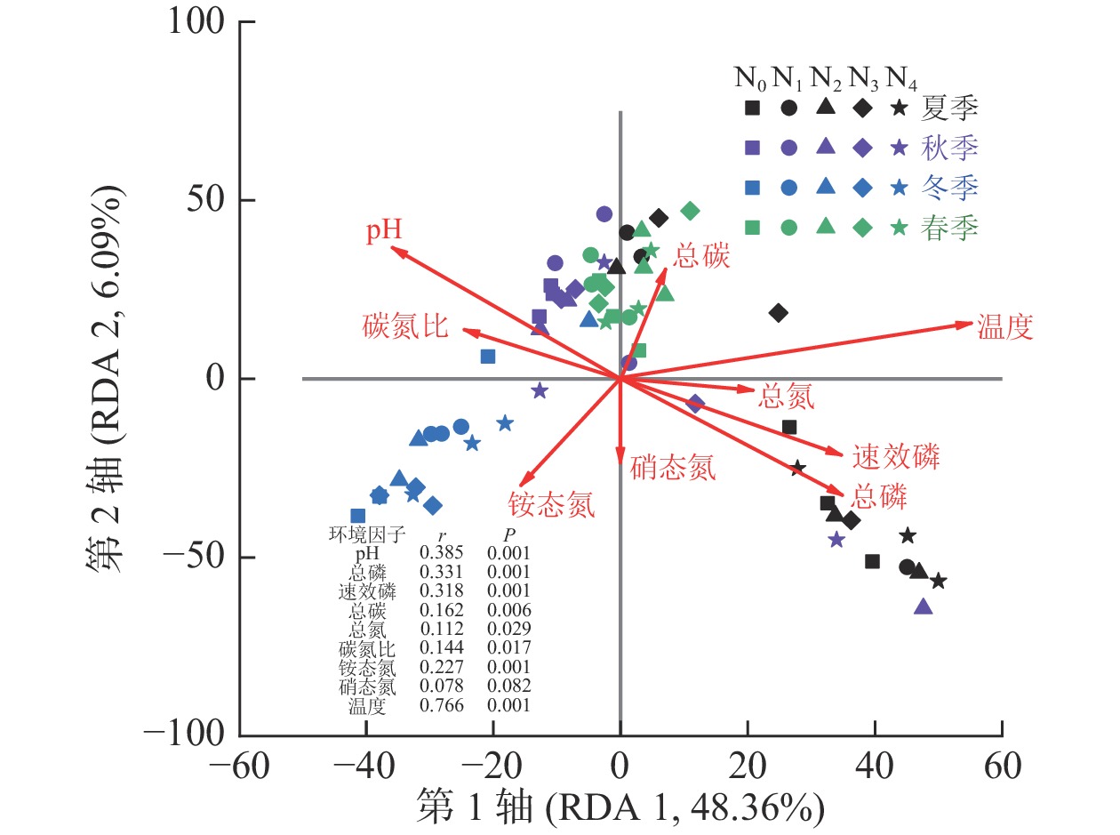 双因素(氮添加和季节)方差分析(表1)表明:季节对所测的10个土壤理化性质均有显著影响,而氮处理对土壤pH、碳氮比、铵态氮和硝态氮质量分数有显著影响(P<0.01)。随着氮添加量的增加,土壤pH和碳氮比均有降低的趋势,且N0、N1和N2处理下两者显著高于N3和N4处理(P<0.05);N4处理下的土壤硝态氮质量分数显著高于其他处理,而铵态氮质量分数在N1处理下最大。不同氮组分随着季节变化呈不同的变化方式:秋季和夏季总氮质量分数显著高于冬季和春季(P<0.05);铵态氮和硝态氮质量分数的最大值分别出现在冬季和秋季,且显著高于其余季节(P<0.05)。此外,随季节的变化土壤温度从大到小依次为夏季、秋季、春季、冬季,而土壤湿度从大到小依次为冬季、春季、夏季、秋季,且各季节间均有显著差异(P<0.05)。