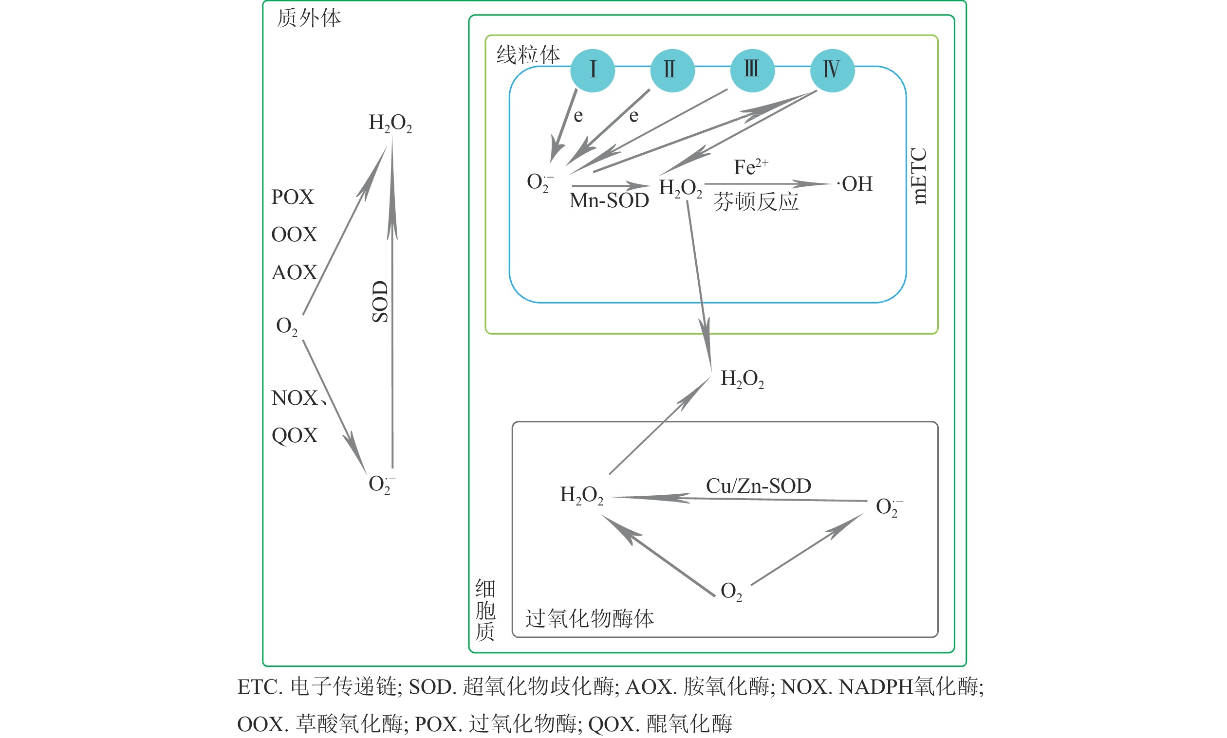 ${\rm{O}}_2^{\cdot-} $ [28],然后被Mn-超氧化物歧化酶(SOD)催化形成相对稳定、存活期较长且具有透膜性的H2O2[29],H2O2可以与还原的Fe2+通过芬顿(Fenton)反应进一步生成反应活性较高的·OH[30],·OH还可以由只有中度反应活性的${\rm{O}}_2^{\cdot-} $ 和H2O2通过哈勃·韦斯反应转化而来[31]。过氧化物酶体是微体的一种,其正常的代谢过程就会产生ROS[18],是胞内产生H2O2的最主要部位。过氧化物酶体还通过光呼吸乙醇酸氧化酶反应(GOX)、脂肪酸β-被酰基辅酶A氧化酶(ACO)氧化、黄素氧化酶的酶反应以及${\rm{O}}_2^{\cdot-} $ 自由基被SOD歧化来生成H2O2[32-33]。质膜普遍存在电子传递氧化还原酶而产生ROS。NADPH氧化酶(NOX)催化电子由胞质NADPH向O2转移从而生成${\rm{O}}_2^{\cdot-} $ ,${\rm{O}}_2^{\cdot-} $ 自发歧化或被SOD催化形成H2O2。 -