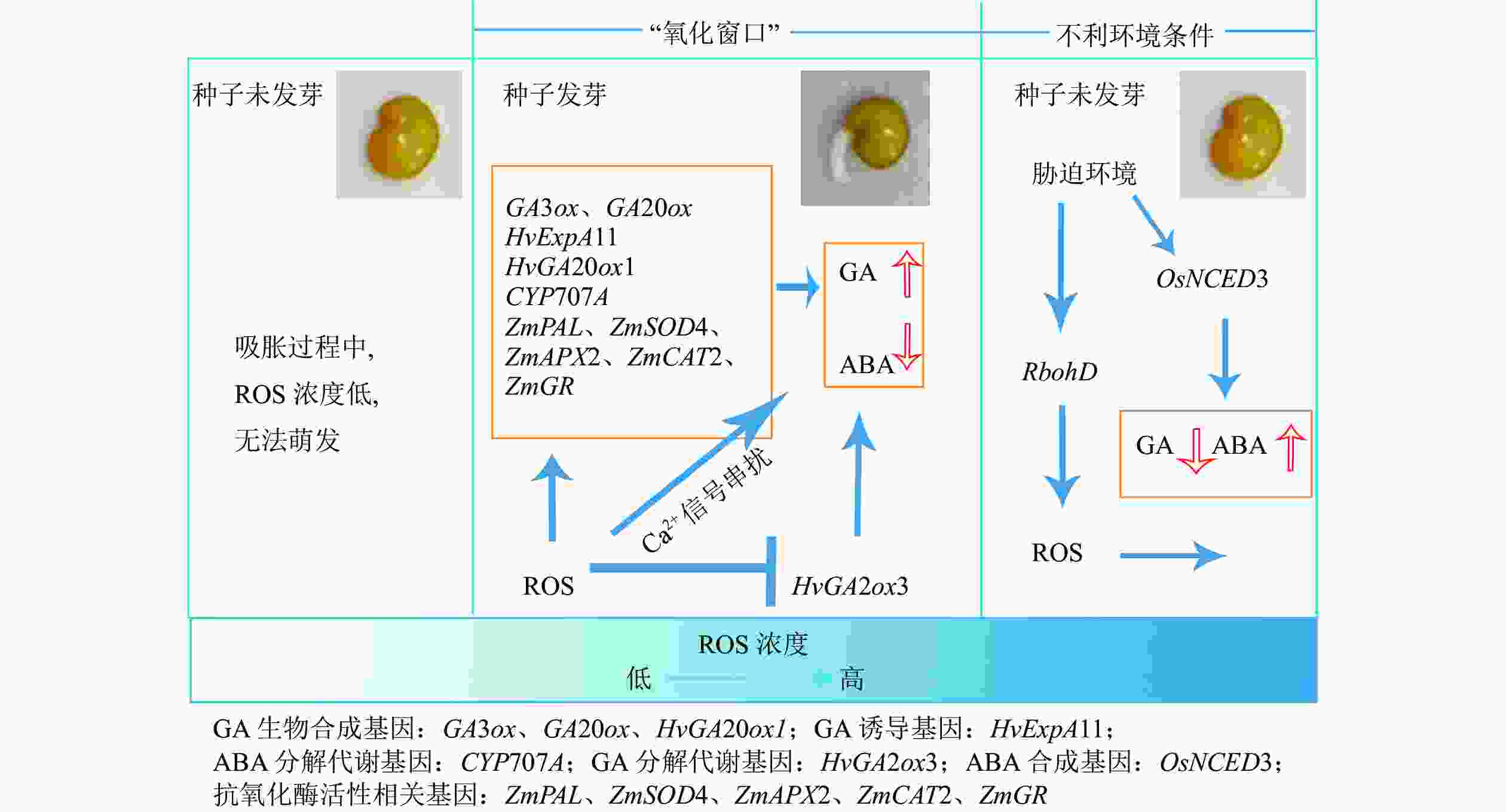 在种子萌发中,ROS起到了很重要的作用。ROS通过生物大分子氧化、种皮弱化促进种子休眠的释放,在种子萌发的早期阶段,ROS生成并参与环境条件的感知和转导,如激素信号,最后阶段,ROS会攻击细胞壁多糖并导致承重结构破坏,致使细胞壁松动,大量吸水促使胚根伸长。ROS的稳态参与种子萌发,其浓度影响种子萌发与休眠。当种子中ROS浓度过高时,会引起氧化损伤,影响种子萌发,只有适宜的ROS浓度,才能增强GA合成基因、ABA分解代谢基因和抗氧化酶活性相关基因的表达,达到促进种子萌发的作用,这被称为“氧化窗口”。在种子内,若ROS的浓度在这个“氧化窗口”以上或以下水平都不能对种子萌发起到积极作用。