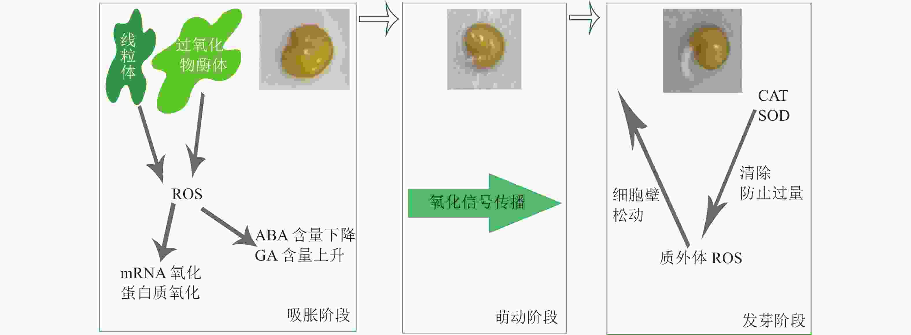 ${\rm{O}}_2^{\cdot-}$ )、过氧化氢(H2O2)、羟自由基(·OH)、单态氧(1O2)、羟基自由基(HO·)等[18]。近年来,越来越多的研究发现很多作物的种子发芽都与ROS的产生密切相关[19-21]。ROS在种子中的作用并不像之前认为的那样消极,而是对于种子萌发起到一定的积极作用[22-24]。 -