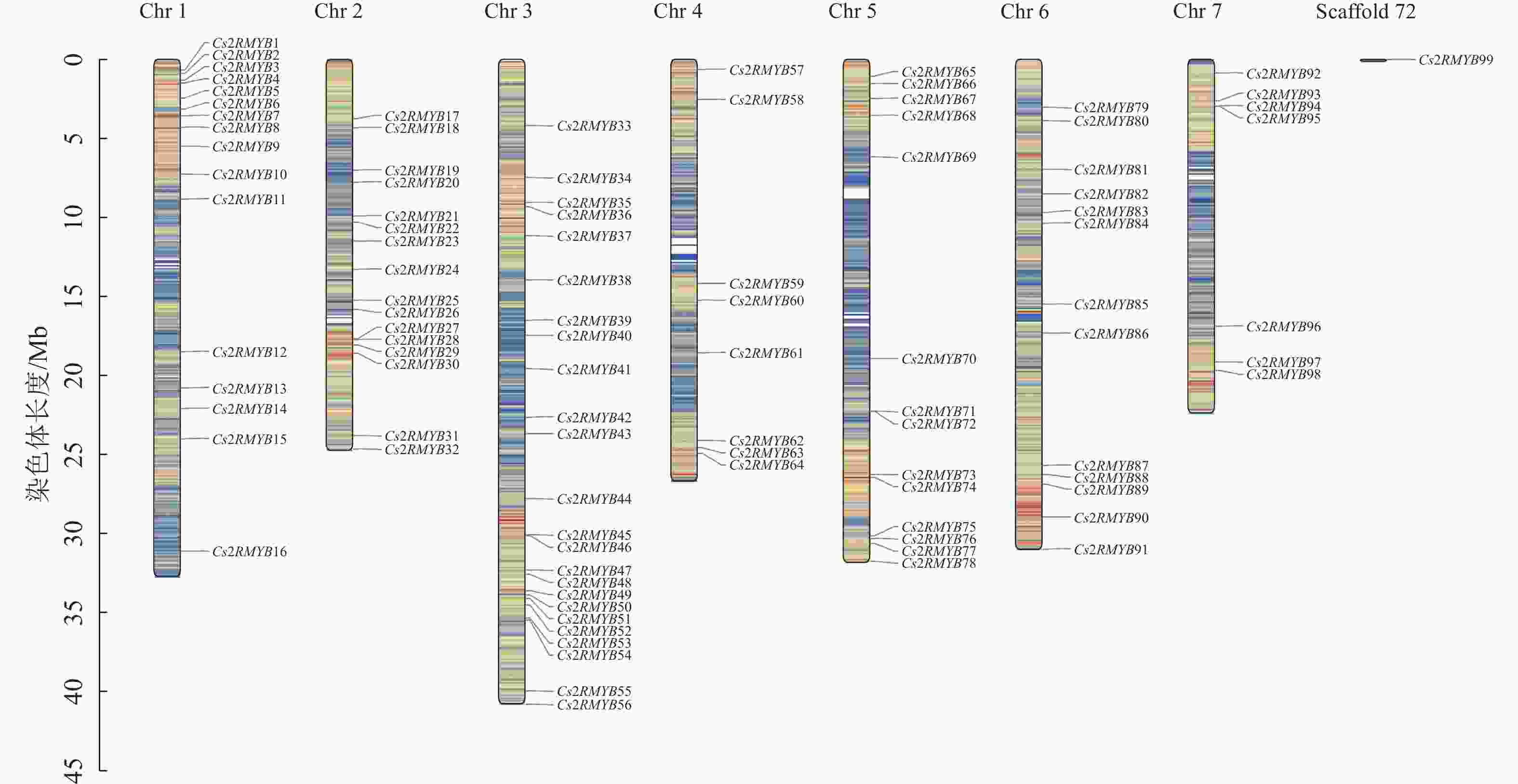 • 黄瓜R2R3-MYB亚家族成员映射于1~7号染色体上,Cs2RMYB99的染色体定位结果未知(图2)。每条染色体上的基因分布相对不均匀,1、4、5、7号染色体上基因大多分布在上下两端,而剩下的染色体上基因分布较为均匀。3号染色体上数量最多,可以定位到24个R2R3-MYB亚家族成员;1、2号染色体各有16个R2R3-MYB亚家族成员;5、6号染色体分别为14和13个R2R3-MYB亚家族成员;7号染色体上最少,为7个R2R3-MYB亚家族成员。此外,2号染色体上的Cs2RMYB27和Cs2RMYB28、3号染色体上的Cs2RMYB45和Cs2RMYB46、5号染色体上的Cs2RMYB71和Cs2RMYB72、7号染色体上的Cs2RMYB94和Cs2RMYB95均在各自染色体上形成基因簇。根据进化树分析可知:形成基因簇的成员之间同源性较高,推测成员间功能相对保守。