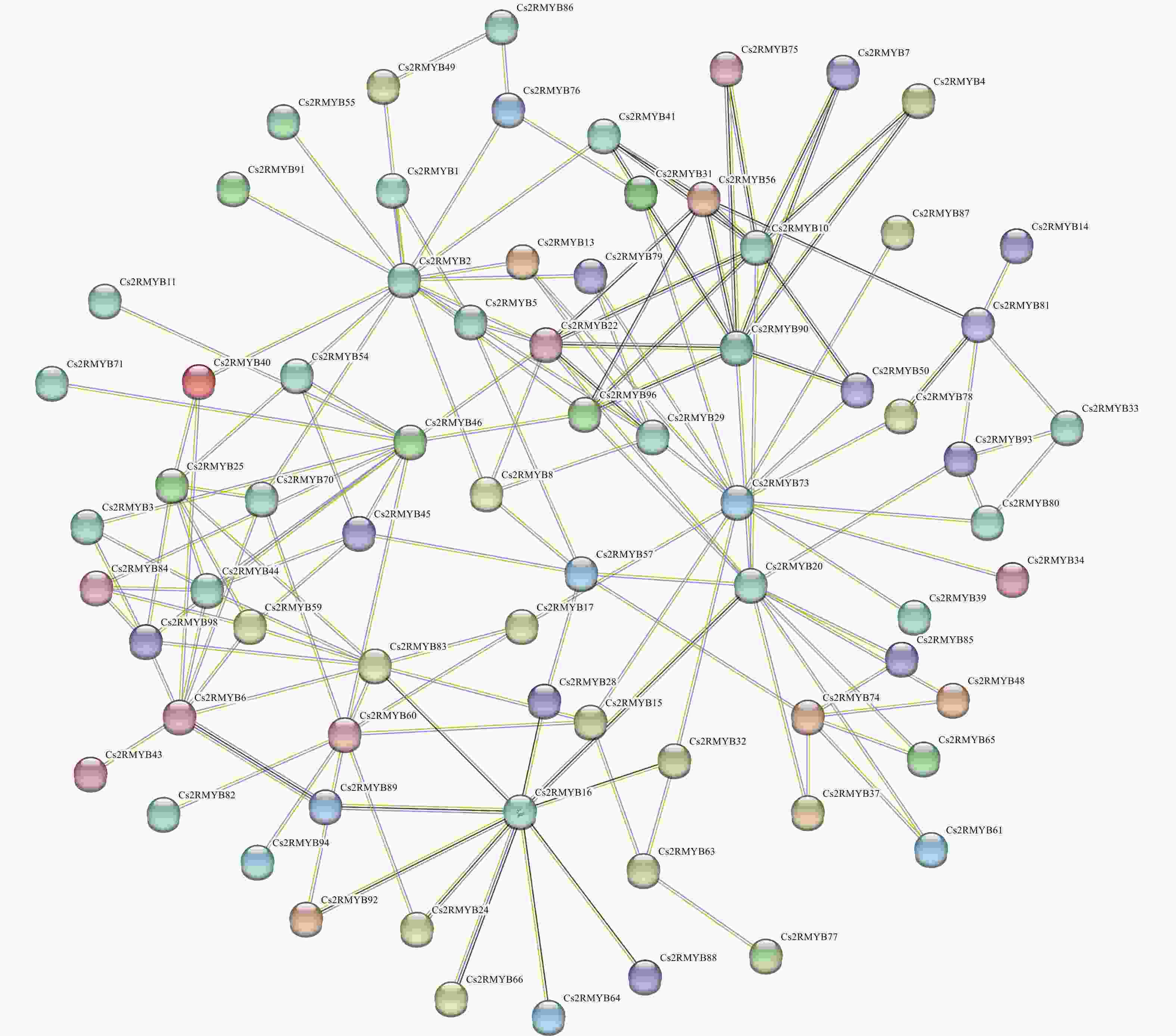 • 为深入了解黄瓜R2R3-MYB亚家族成员蛋白的互作情况,对99个成员进行蛋白质互作预测(图7),结果表明:Cs2RMYB25、Cs2RMYB3、Cs2RMYB84、Cs2RMYB98、Cs2RMYB6、Cs2RMYB6均与Cs2RMYB44存在互作关系;Cs2RMYB96、Cs2RMYB22、Cs2RMYB31、Cs2RMYB41、Cs2RMYB56、Cs2RMYB75、Cs2RMYB7、Cs2RMYB4、Cs2RMYB50均与Cs2RMYB90存在互作关系,且有较强的关联性。此外,部分成员间虽存在互作相关性,但各成员之间的具体机制并不明晰,仍需进一步深入研究。