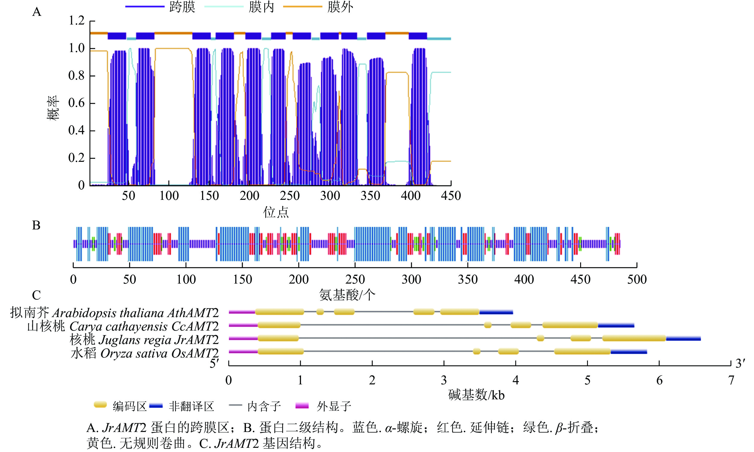 对JrAMT2 蛋白二级结构的预测结果显示:JrAMT2的氨基酸组成中有4种构象,其中 α- 螺旋有 201 个氨基酸,占比 43.12%;延伸链有 93个氨基酸,占比19.10%;β- 转角有 30个氨基酸,占比 6.16%;无规则卷曲有154个氨基酸,占比 31.62%。JrAMT2 铵转运蛋白主要由 α- 螺旋和无规则卷曲组成(图2B)。
