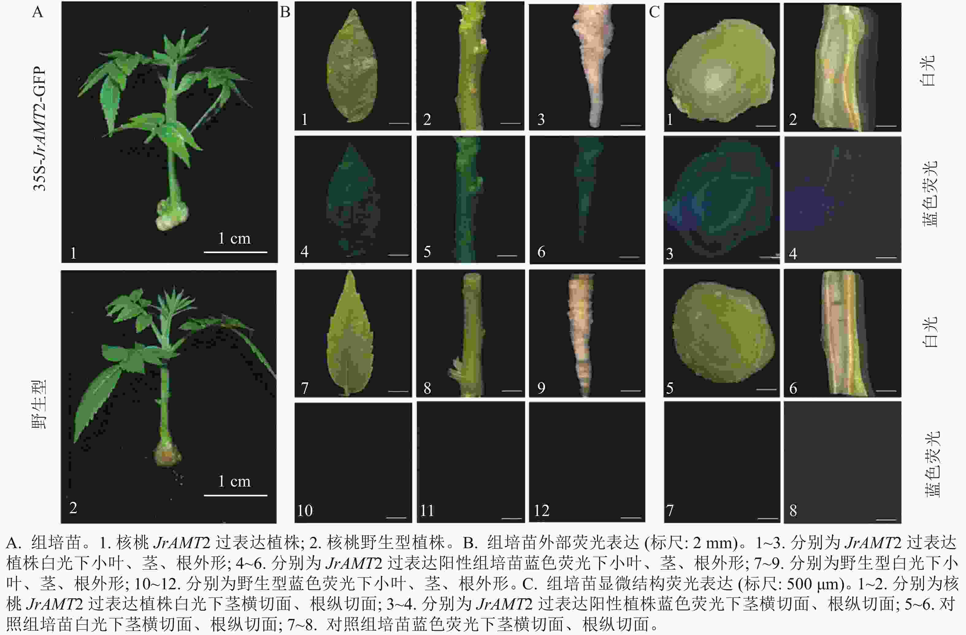 • 在成功构建35S::JrAMT2::GFP的过表达载体并通过农杆菌介导转化核桃体胚后,对同一无性系JrAMT2体胚经脱水萌发获得的再生植株进行阳性鉴定。利用PCR技术,以核桃JrAMT2过表达植株3个株系(JrAMT2-1、JrAMT2-2和JrAMT2-3) DNA为模板,进行外源GFP基因(729 bp)的PCR验证,检测到大小约为 750 bp的电泳条带,与GFP基因大小符合(图3A);进行目的基因JrAMT2加外源GFP基因全长(2193 bp)的PCR验证,检测到大小为2000 bp的电泳条带,与目的基因大小符合(图3B);以核桃JrAMT2过表达植株3个株系的cDNA为模板,利用实时定量PCR技术对JrAMT2基因表达量进行检测,结果显示:核桃JrAMT2过表达植株3个株系JrAMT2基因相对表达量分别为野生型的10.58、12.80和14.94倍,显著上调(图3C),表明核桃JrAMT2过表达植株中JrAMT2基因稳定表达。