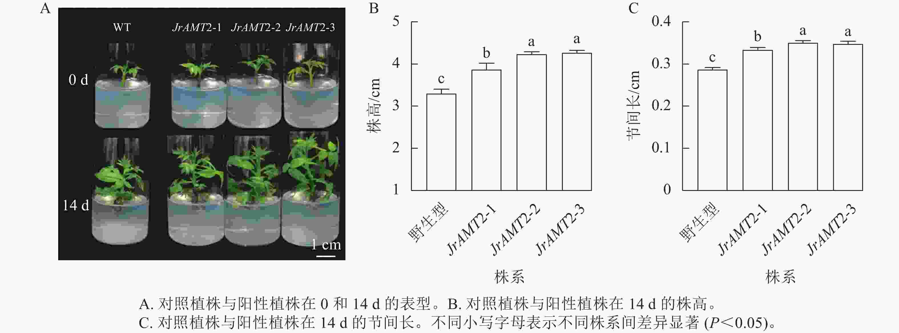 • 分别选取生长状态一致的核桃野生型与3个核桃JrAMT2过表达株系组培苗,从顶尖向下剪取1.5 cm茎段,含2~4片复叶,培养14 d,每个株系均5个生物学重复,测量株高及节间数。选取长势相同的核桃野生型及JrAMT2过表达植株采用2步生根法驯化,移栽后用直尺测量统计不同株系生长0、20、40 d的株高、节间长、叶片长度及叶片宽度。