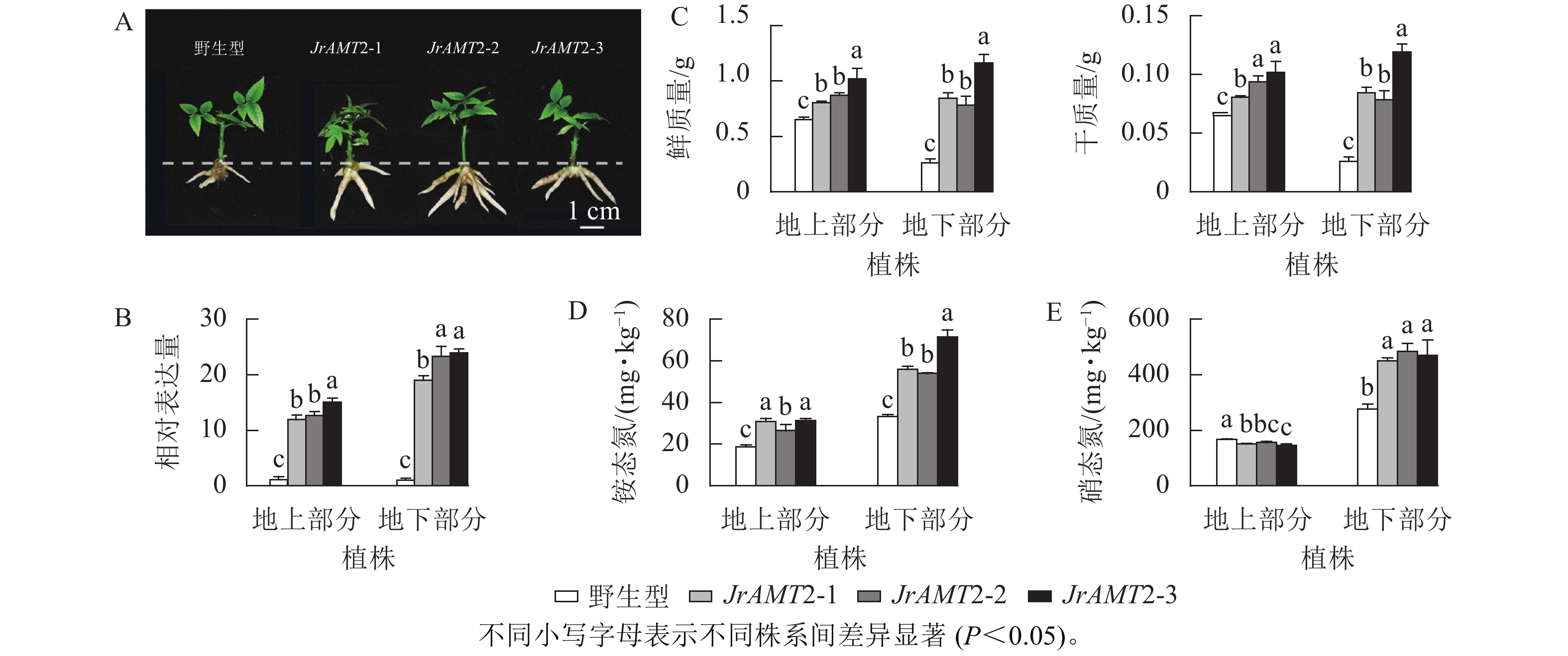 分别选取生长状态一致的核桃野生型与3个核桃JrAMT2过表达株系组培苗,培养14 d,采用2步生根法获得核桃生根植株,植株分为地上部分及地下部分2个部分,清洗植株,分别测定地上部分及地下部分鲜质量,于105 ℃下杀青,80 ℃烘干至恒量,称取干质量。使用苏州科铭生物技术有限公司的植物铵态氮(ZATD-1-G)和植物硝态氮(ZXTD-1-G)试剂盒测定地上部分及地下部分铵态氮和硝态氮质量分数,每个株系均5个生物学重复。