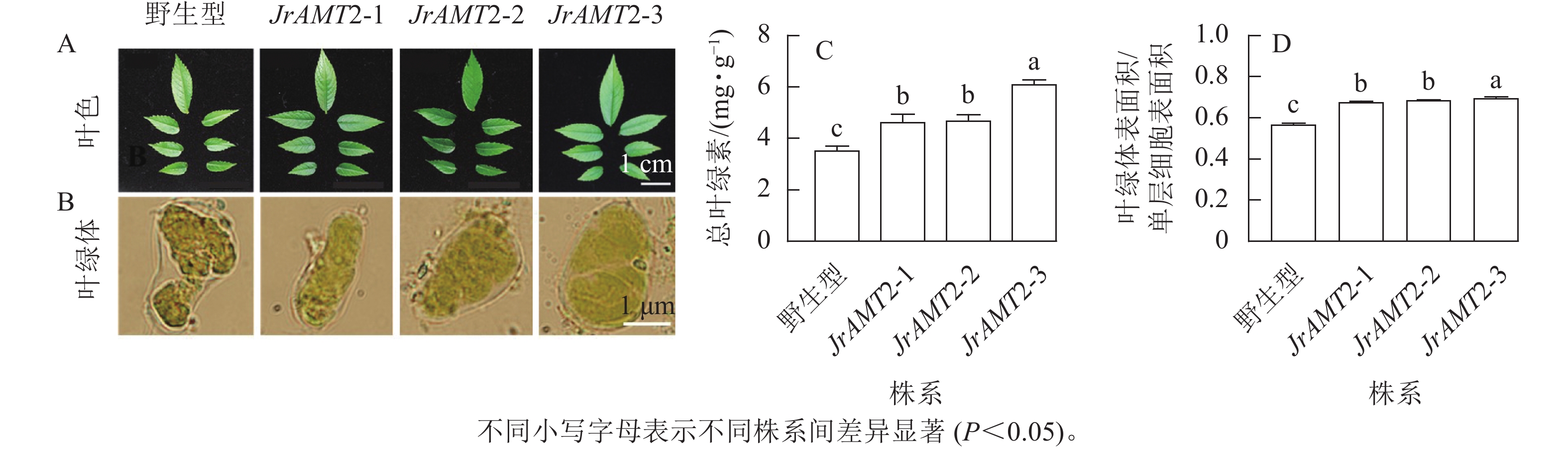 • 对核桃JrAMT2过表达植株叶色与叶片细胞叶绿体进行观察。核桃JrAMT2过表达植株叶色与野生型相比颜色较深(图8A),在显微镜下观察3个核桃JrAMT2过表达植株株系及野生型叶绿体特征发现,3个核桃JrAMT2过表达株系扩张的栅栏叶肉细胞中的叶绿体更致密(图8B)。进一步分析发现:对3个阳性株系进行总叶绿素质量分数测定,3个核桃JrAMT2过表达株系叶绿素质量分数显著高于野生型(P<0.05),野生型总叶绿素质量分数为3.53 mg·g−1,核桃JrAMT2过表达阳性植株3个株系总叶绿素质量分数分别为4.64、4.69和6.10 mg·g−1,与野生型相比分别增加了32.6%、34.0%和74.3% (图8C);JrAMT2过表达株系叶绿体表面积在单层细胞表面积的占比显著高于野生型(P<0.05),野生型叶绿体表面积与单层细胞表面积的比率为0.56,3个核桃JrAMT2过表达株系叶绿体表面积与单层细胞表面积的比值分别为0.67、0.68和0.69,与野生型相比分别增加了19.41%、21.18%和22.94% (图8D)。综上所述,JrAMT2基因过表达提高了叶绿体表面积与单层细胞表面积的比率及核桃叶肉细胞内叶绿素的积累。
