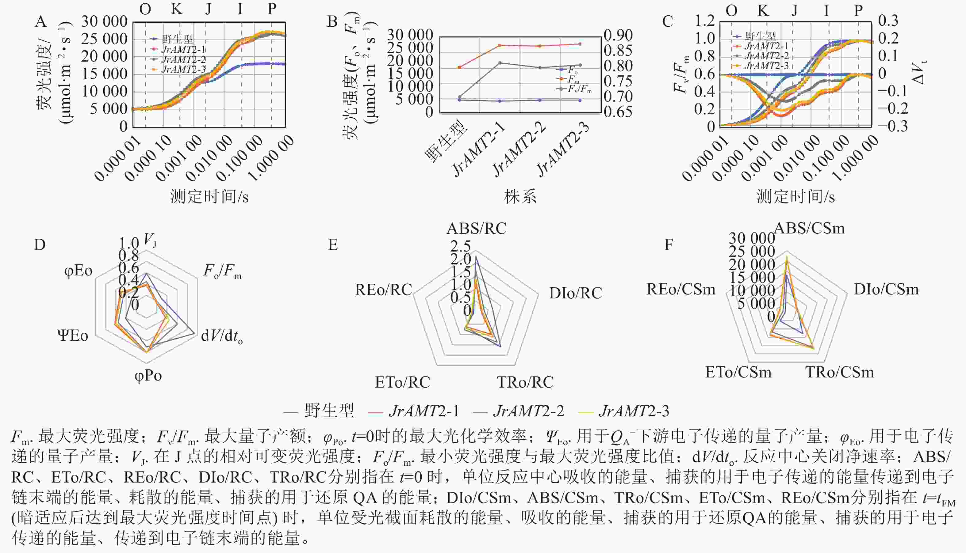 用JIP-test参数对OJIP曲线进行定量分析,结果显示:核桃3个JrAMT2过表达株系在t=0时的最大光化学效率(φPo)、反应中心捕获的光能用于${\rm{Q}}_{\rm{A}}^- $下游电子传递的量子产量(ΨEo)、吸收的能量用于电子传递的量子产量(φEo)上升,分别上升了14.62%、44.59%、65.80%;在J点的相对可变荧光强度(VJ)、最小荧光强度与最大荧光强度比值(Fo/Fm)、反应中心关闭净速率(dV/dto)下降,分别下降了31.03%、35.29%、49.34% (图9D),表明JrAMT2基因一定程度上提高了PS反应中心的量子比率及产额;对单位PS反应中心比活性参数分析,结果显示:与野生型相比,3个核桃JrAMT2过表达株系在t=0 时的单位反应中心捕获的用于电子传递的能量(ETo/RC)、在t=0 时的单位反应中心传递到电子链末端的能量(REo/RC)无明显变化,在t=0 时单位反应中心吸收的能量(ABS/RC)、在t=0 时单位反应中心耗散的能量(DIo/RC)、在t=0 时单位反应中心捕获的用于还原QA的能量(TRo/RC)显著下降,分别为36.43%、58.67%、27.22%,表明JrAMT2基因一定程度提高了核桃叶片反应中心活性和用于电子传递的能量份额,增强了电子传递能力(图9E);对单位受光截面比活性参数分析,结果显示:与野生型相比,3个核桃JrAMT2过表达株系在t=tFM(暗适应后达到最大荧光强度时间点)时的单位受光截面耗散的能量(DIo/CSm)无明显变化,在t=tFM时单位受光截面吸收的能量(ABS/CSm)、在t=tFM时单位受光截面捕获的用于还原QA的能量(TRo/CSm)、在t=tFM时单位受光截面捕获的用于电子传递的能量(ETo/CSm)、在t=tFM时单位受光截面传递到电子链末端的能量(REo/CSm)上升,分别上升了 47.79%、69.39%、145.10%、303.62%(图9F),表明JrAMT2基因一定程度提高核桃叶片单位受光截面的电子传递的份额及电子传递效率。综上所述,JrAMT2基因过表达促进核桃的光合作用。