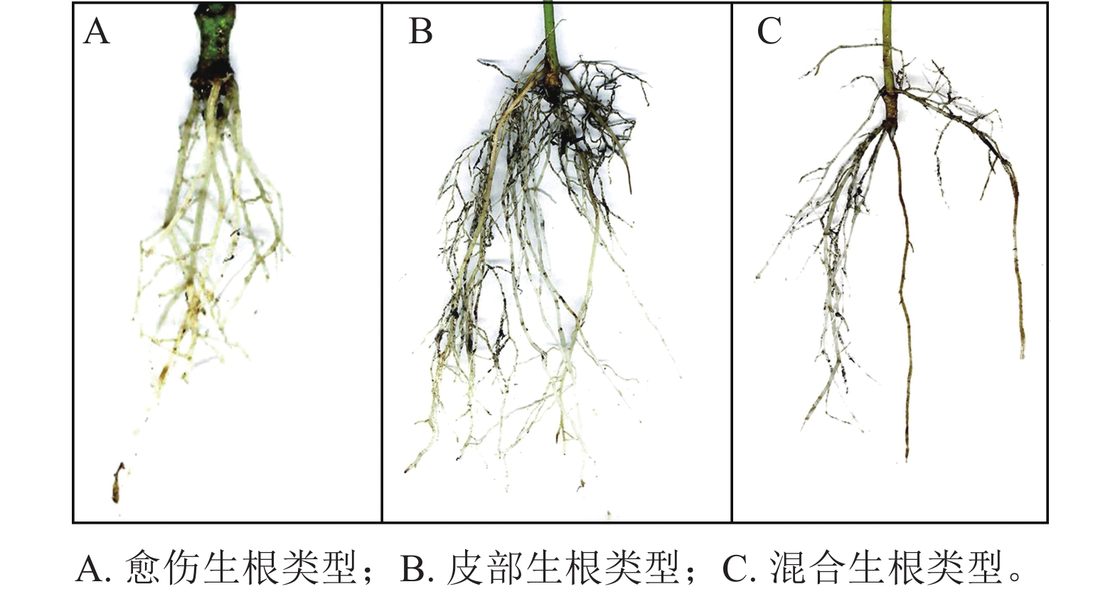 根据插穗的外部形态观察(图1),东京四照花嫩枝插穗的愈伤组织部位和皮部均可以产生不定根,其中以皮部生根类型为主,占生根数的58.6%;混合生根类型次之,占生根数的30.1%;愈伤生根比例最少,仅为11.3%。
