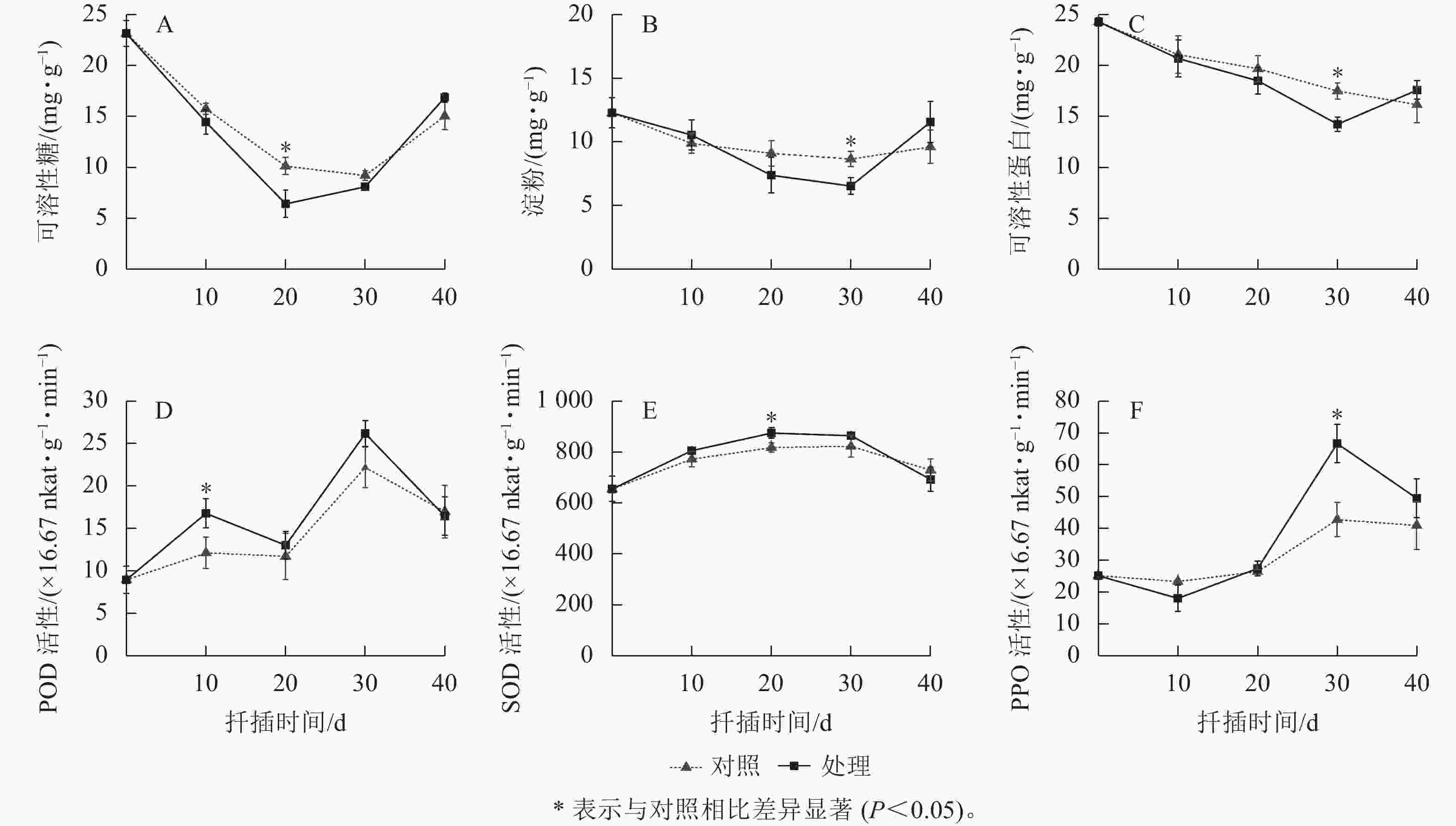 采用蒽酮-硫酸比色法测定可溶性糖和淀粉,采用G-250考马斯亮蓝法测定可溶性蛋白;采用愈创木酚法测定POD活性,采用邻苯二酚法测定PPO活性,采用氮蓝四唑(NBT)法测定SOD活性[19]。