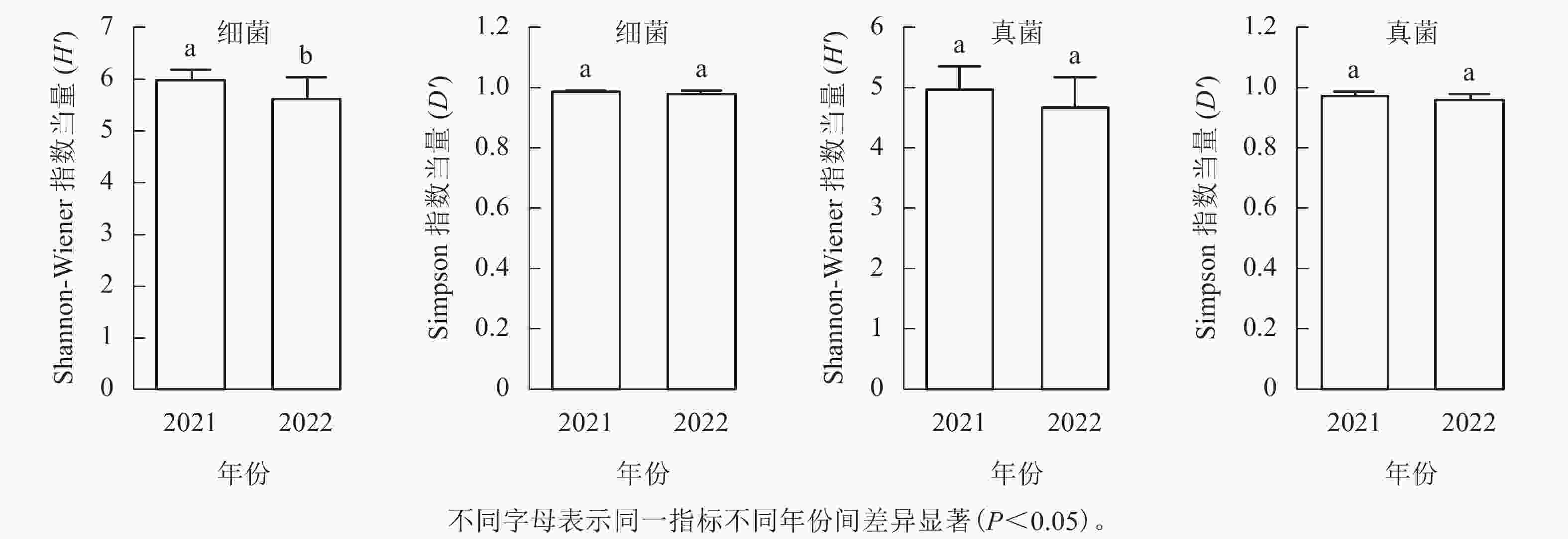 从图1可见:每个土壤样品细菌的Shannon-Wiener指数为4.82~6.37,均值为5.87,Simpson指数为0.95~0.99,均值为0.98;真菌Shannon-Wiener指数为3.84~5.56,均值为4.88,Simpson指数为0.92~0.99,均值为0.97。2021年采集的土壤细菌H'显著高于2022年(P<0.05),但D'无显著差异;真菌的H'和D'在2个取样年份间差异不显著。