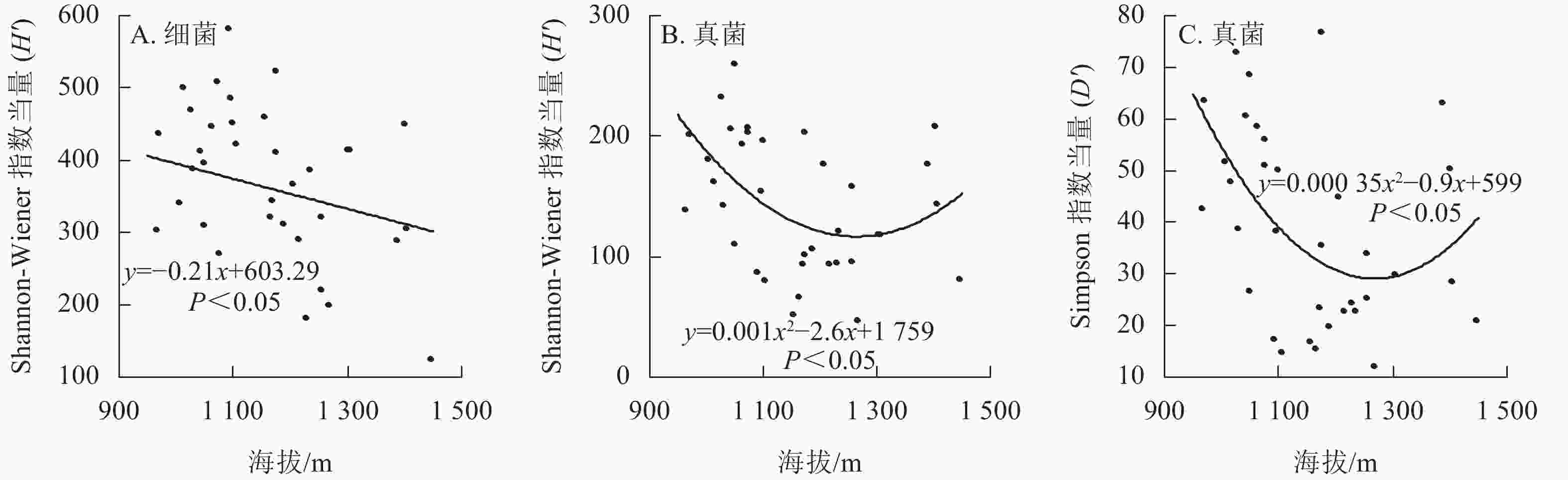 除了气候因素外,海拔和坡向是影响土壤微生物α多样性的重要因素[30−31]。有研究表明:土壤微生物α多样性在南坡和北坡对海拔变化的响应不同[31]。然而,本研究结果显示:九龙山香果树生境土壤微生物α多样性与坡向无关。海拔因子极其复杂,许多生态因子,如温度、湿度、辐射、植被等,都会随海拔的变化而改变,生态因子在海拔梯度上的变化比在纬度梯度上的变化快1 000倍[30]。目前,土壤微生物α多样性沿海拔梯度的变化模式主要包括单调递减、单调递增、单峰、下凹和无趋势等5种[31]。本研究表明:九龙山香果树生境细菌和真菌α多样性随海拔上升呈不同的变化趋势。
