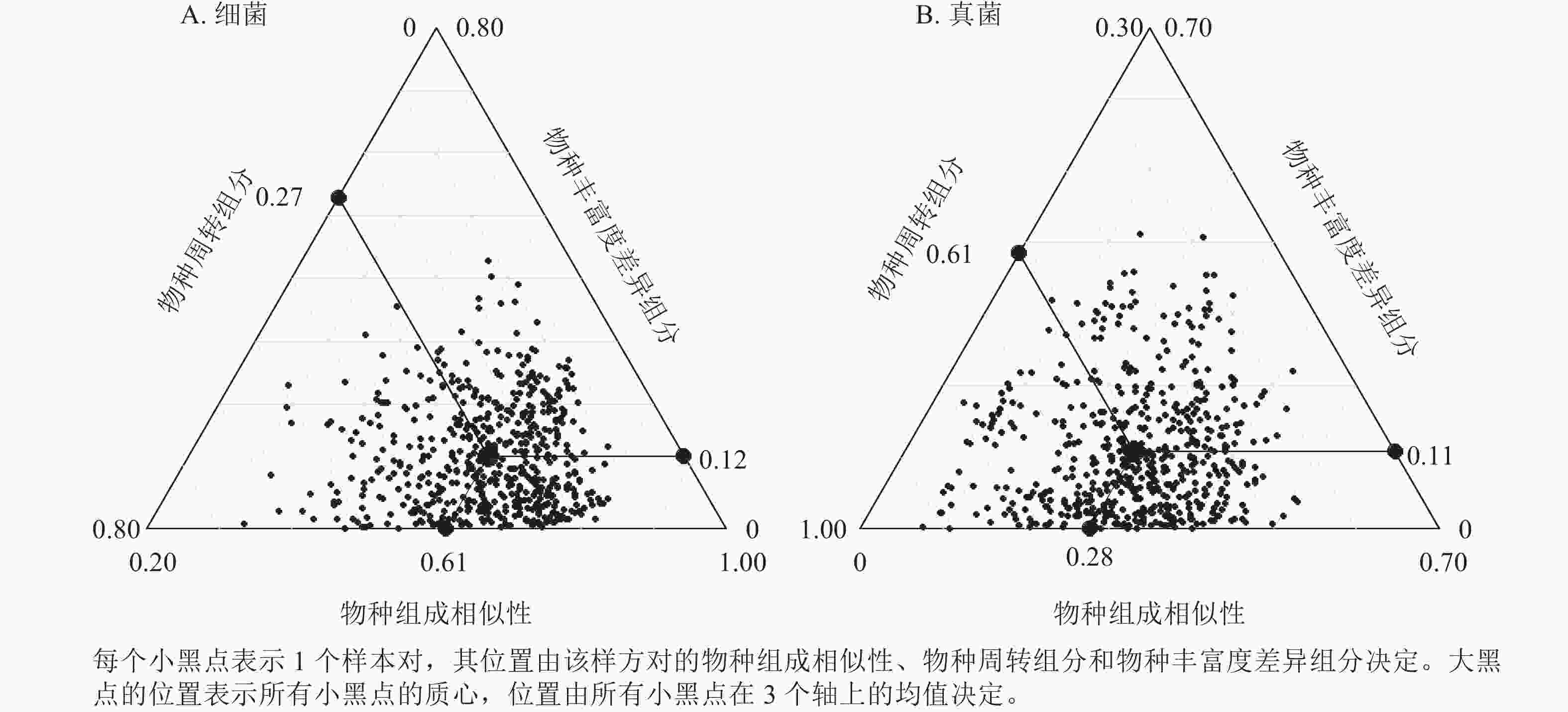 九龙山香果树生境土壤细菌β多样性为0.19~0.72,均值为0.39,其中物种周转组分为0.08~0.66,均值0.27,物种丰富度差异组分为0~0.43,均值为0.12 (图3A)。物种周转组分对土壤细菌β多样性的贡献达70.2%,而物种丰富度差异组分对土壤细菌β多样性的贡献占29.8%。香果树生境土壤真菌β多样性为0.49~0.96,均值为0.72,其中物种周转组分为0.37~0.92,均值为0.61,物种丰富度差异组分为0~0.41,均值为0.11 (图3B)。物种周转组分对土壤真菌β多样性的贡献高达85.1%,而物种丰富度差异组分对土壤真菌β多样性的贡献仅占14.9%。
