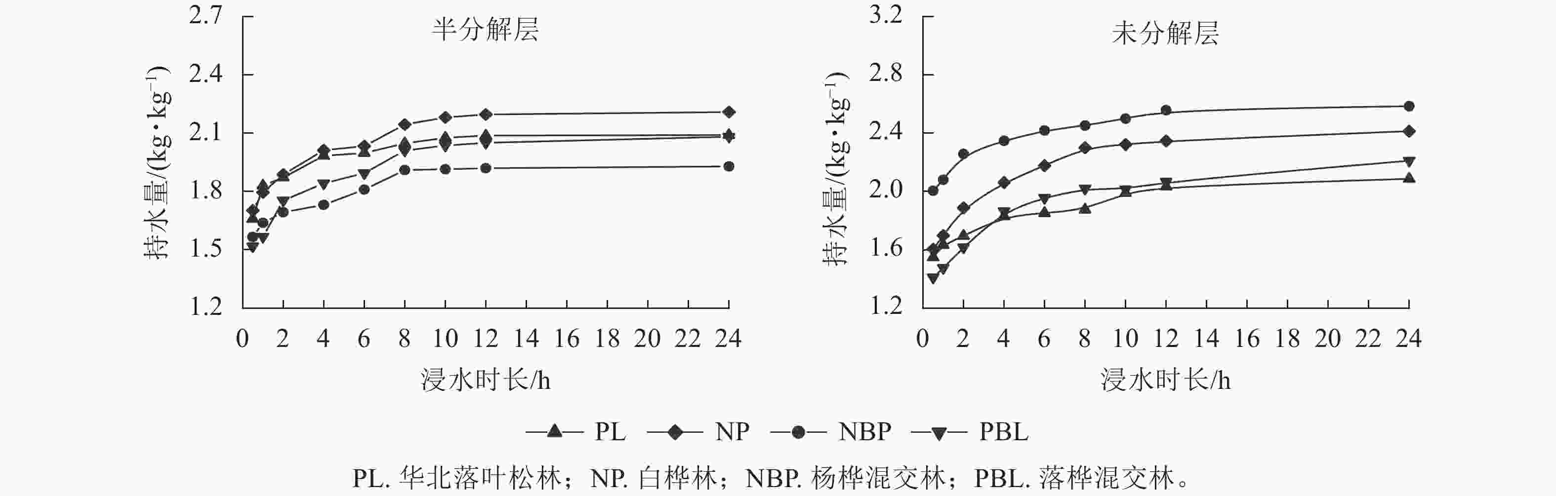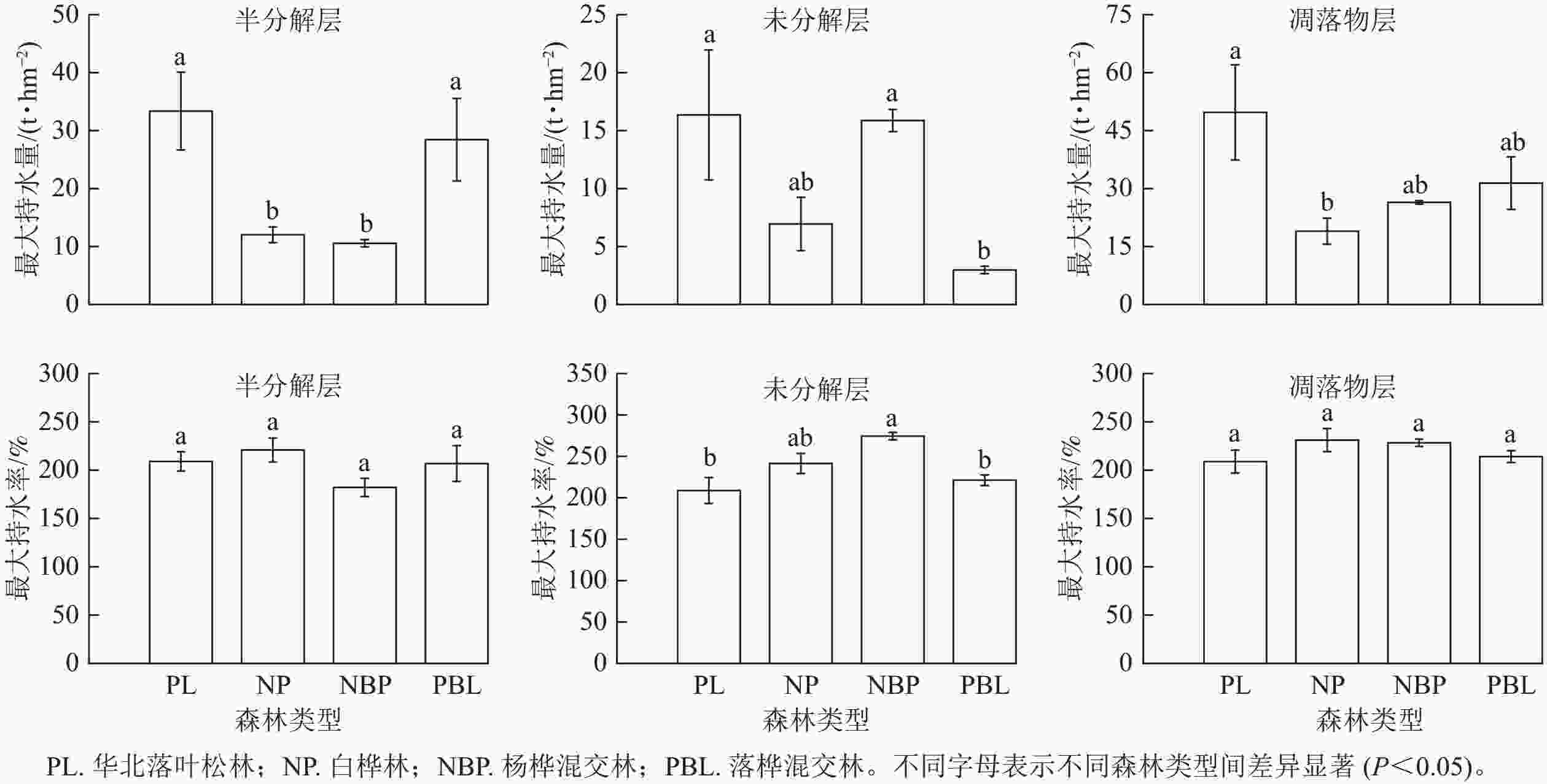 凋落物层的最大持水率白桦林最大,为231.15%,杨桦混交林和落桦混交林次之,华北落叶松林最小,为208.92%,不同森林类型间最大持水率无显著差异。半分解层最大持水率为182.17%~220.90%,从大到小依次为白桦林、华北落叶松林、落桦混交林、杨桦混交林,不同森林类型间无显著差异。未分解层最大持水率为208.77%~274.51%,从大到小依次为杨桦混交林、白桦林、落桦混交林、华北落叶松林,杨桦混交林显著大于华北落叶松林和落桦混交林(P<0.05)。除华北落叶松林外,其他3种森林类型未分解层最大持水率均大于半分解层。