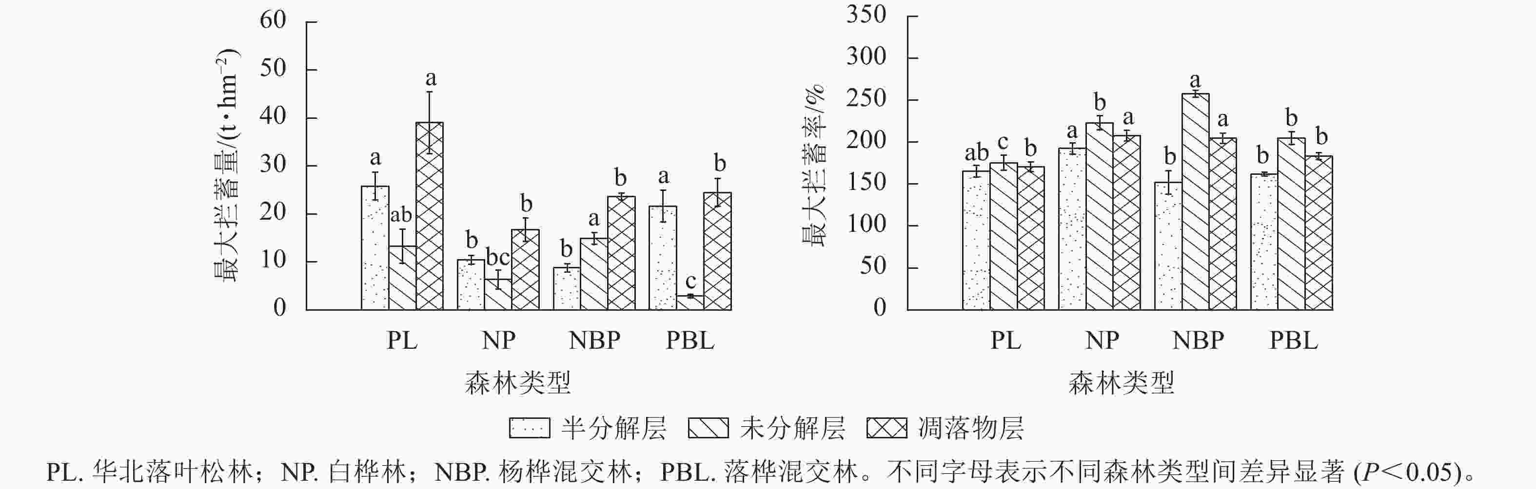 凋落物层的最大拦蓄率从大到小依次为白桦林、杨桦混交林、落桦混交林、华北落叶松林,与凋落物层最大持水率的变化规律一致,其中,白桦林和杨桦混交林显著大于落桦混交林、华北落叶松林(P<0.05)。半分解层最大拦蓄率为151.84%~192.28%,从大到小依次为白桦林、华北落叶松林、落桦混交林、杨桦混交林,其中,白桦林显著大于落桦混交林、杨桦混交林(P<0.05)。未分解层最大拦蓄率为175.43%~257.56%,从大到小依次为杨桦混交林、白桦林、落桦混交林、华北落叶松林,其中,杨桦混交林显著大于其他3种森林类型(P<0.05),华北落叶松林显著小于其他3种森林类型(P<0.05)。