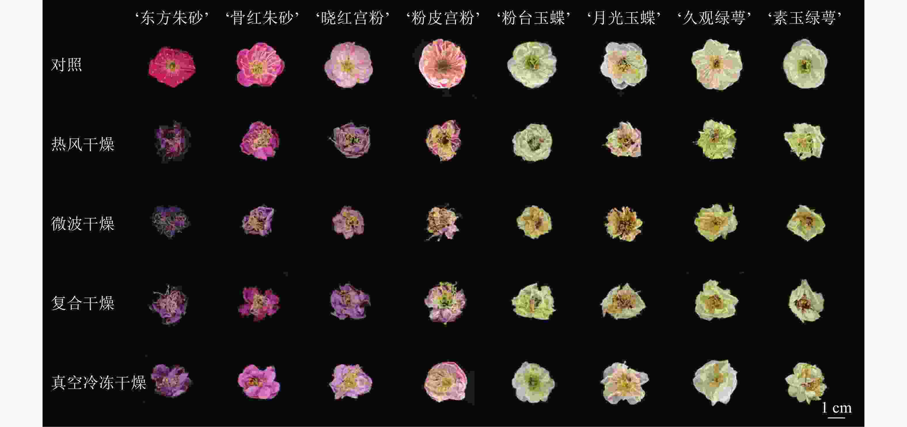 梅Prunus mume隶属于蔷薇科Rosaceae李属Prunus,原产中国南方,距今已有 3 000 多年的栽培历史[1]。目前,食用花卉的风潮日益兴起,花茶越来越受到欢迎,百合Lilium、菊花Chrysanthemum×morifolium、桂花Osmanthus fragrans等食用花卉已被应用于较多产业[2],梅花茶等相关制品具有巨大的开发前景和市场。梅花营养丰富,主要包括黄酮类、苯丙烷类、有机酸类、挥发性物质等化学成分,其中绿原酸、异槲皮苷、金丝桃苷质量分数较高[3]。以异槲皮苷、金丝桃苷为代表的黄酮类化合物具有抗炎、抗抑郁等药理作用,以绿原酸为代表的苯丙烷类化合物具有抗氧化、抑制黑色素形成等作用[4−5]。采摘后的梅花鲜花容易发生虫蛀、霉变,干燥加工能有效避免鲜花变质[6]。在干燥过程中,花茶的色、香、味和活性成分易受影响,干燥方式是梅花花茶品质最关键的影响因素。目前国内对梅花干燥制茶方面的研究相对缺乏,不同干燥方法对梅花花茶各方面品质的影响的研究报道甚少。