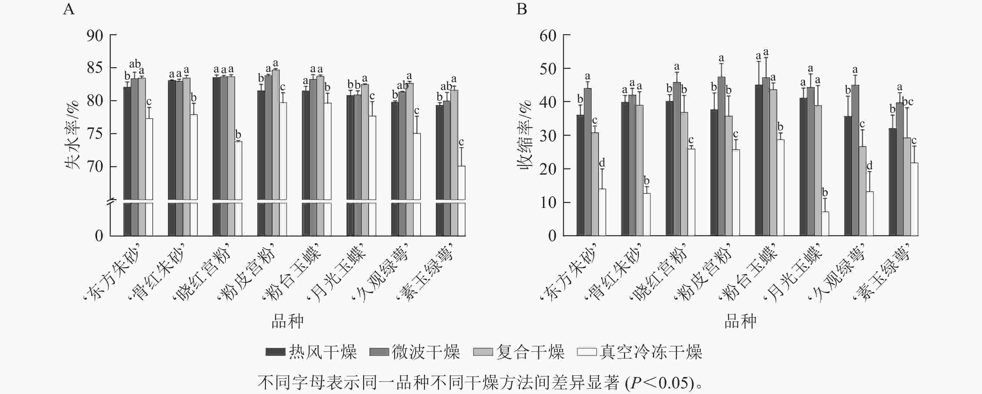 冻干燥‘东方朱砂’ 61B N79B N79A 79N N79B ‘骨红朱砂’ N66C 64A N79D 70B 64 ‘晓红宫粉’ 65A N75A 84C N80D N75B ‘粉皮宫粉’ 65C N74C 84C 77D 75A ‘粉台玉蝶’ NN155B 155A N199D 150D 155A ‘月光玉蝶’ NN155C N155C 157B N155D NN155B ‘久观绿萼’ 155C 4D 2D 155C 155A ‘素玉绿萼’ NN155B 155A 8D 4D 155A 由图3A可知:真空冷冻干燥后梅花的失水率为70.1%~79.7%,表明失水率较低且干燥效率低,其余3种干燥方法失水率均在79.3%以上,其中复合干燥后梅花的失水率显著高于其他3种干燥方法(P<0.05),最大失水率为84.7%。图3B结果表明:真空冷冻干燥后梅花的收缩率显著小于其他3种干燥方式(P<0.05),为7.2%~28.7%,微波干燥后梅花的收缩率最大,为39.7%~47.4%。低温干燥特性能够更好地保持梅花的原有形态。