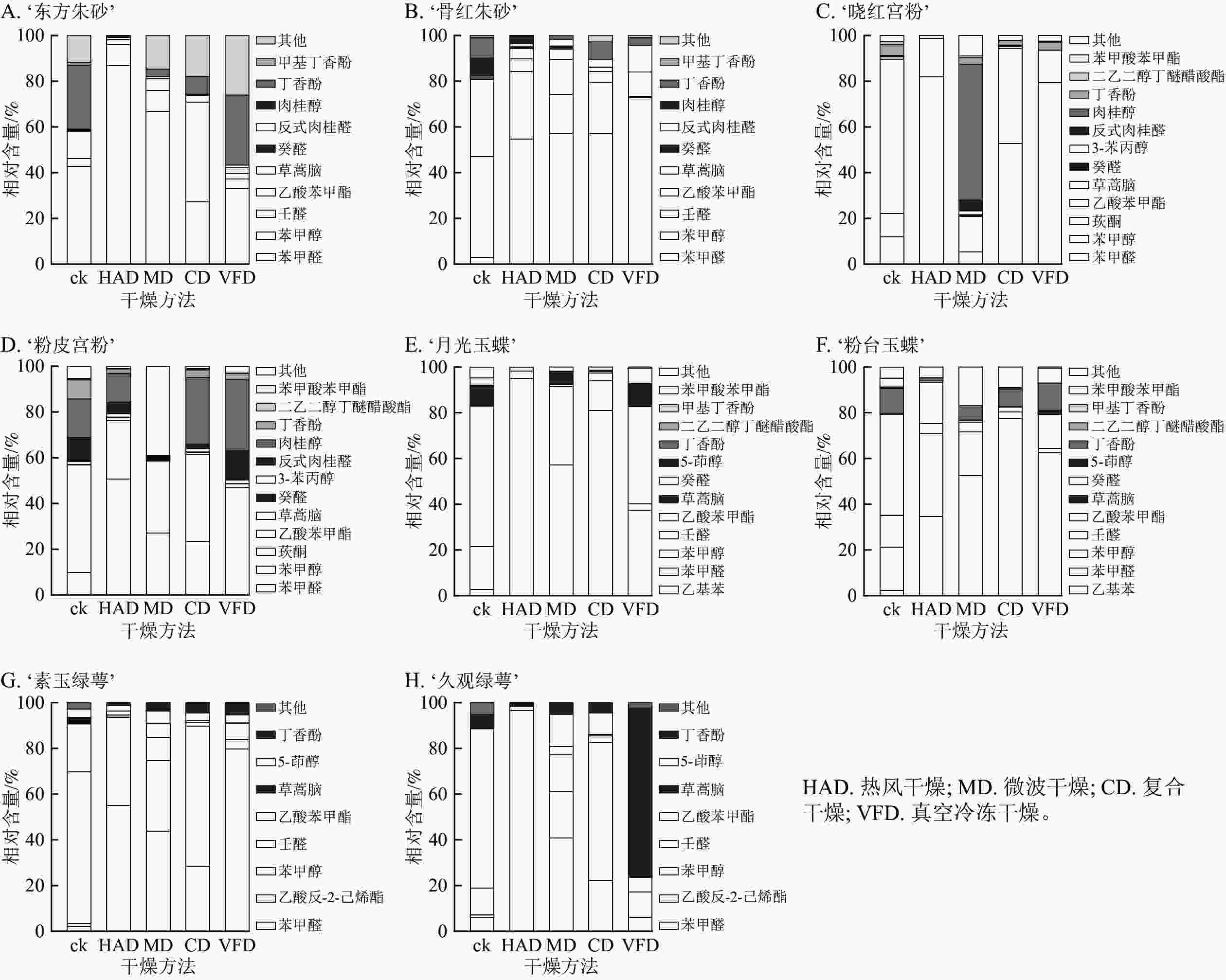从8个梅花品种中鉴定出27种挥发物,这些挥发性成分主要包括醛类、酯类、有机酸、醇类和脂肪类化合物。酯类化合物在梅花花香成分中质量分数最高,苯甲醛、苯甲醇和乙酸苯甲酯等是梅花挥发物的主要成分[26]。由挥发性成分测定结果可知(图6):复合干燥和真空冷冻干燥在保留挥发性成分上具有明显优势,特别是在保留醛类和酯类这2类主要香气成分方面,这2种干燥方法表现出更佳的效果,复合干燥组的总保留率最高,达到50%以上。热风干燥组梅花的香气成分保留结果不稳定,部分梅花品种在热风干燥后挥发性成分保留少。8个梅花品种鲜样挥发性成分中除了‘粉皮宫粉’中检测到壬醛,其余品种只在干燥后检测到壬醛,说明在干燥处理后产生壬醛,梅花香气特征可能发生了改变。