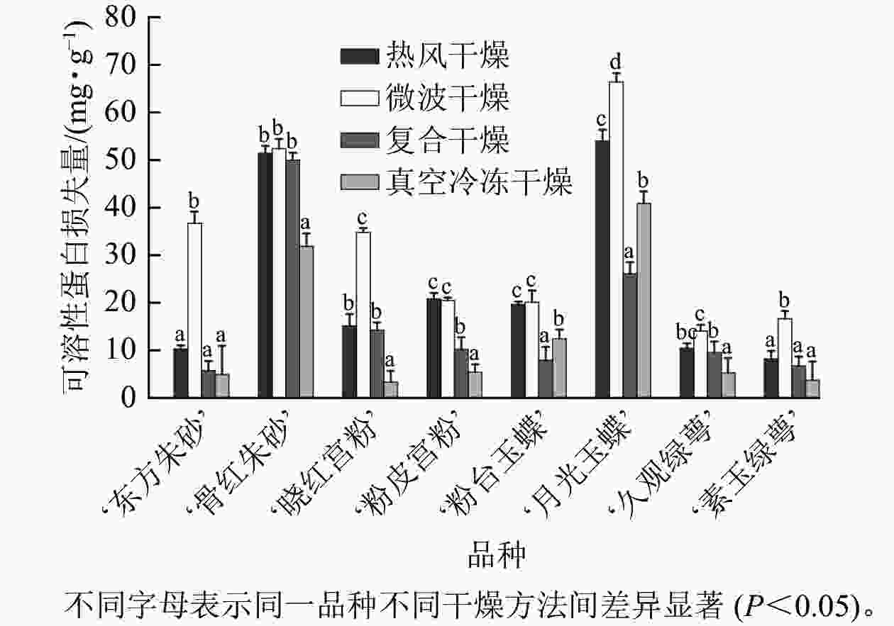 由图7可知:不同干燥方法处理对梅花可溶性蛋白的保留有显著影响。‘月光玉蝶’‘粉台玉蝶’中复合干燥组可溶性蛋白损失显著小于其他干燥方法(P<0.05),损失量分别为26.08、7.92 mg·g−1,‘东方朱砂’‘骨红朱砂’‘晓红宫粉’‘粉皮宫粉’‘久观绿萼’‘素玉绿萼’中,真空冷冻干燥组可溶性蛋白质量分数损失小于其他3种干燥方法,损失量分别为4.91、31.86、3.34、5.38、5.26、3.70 mg·g−1。
