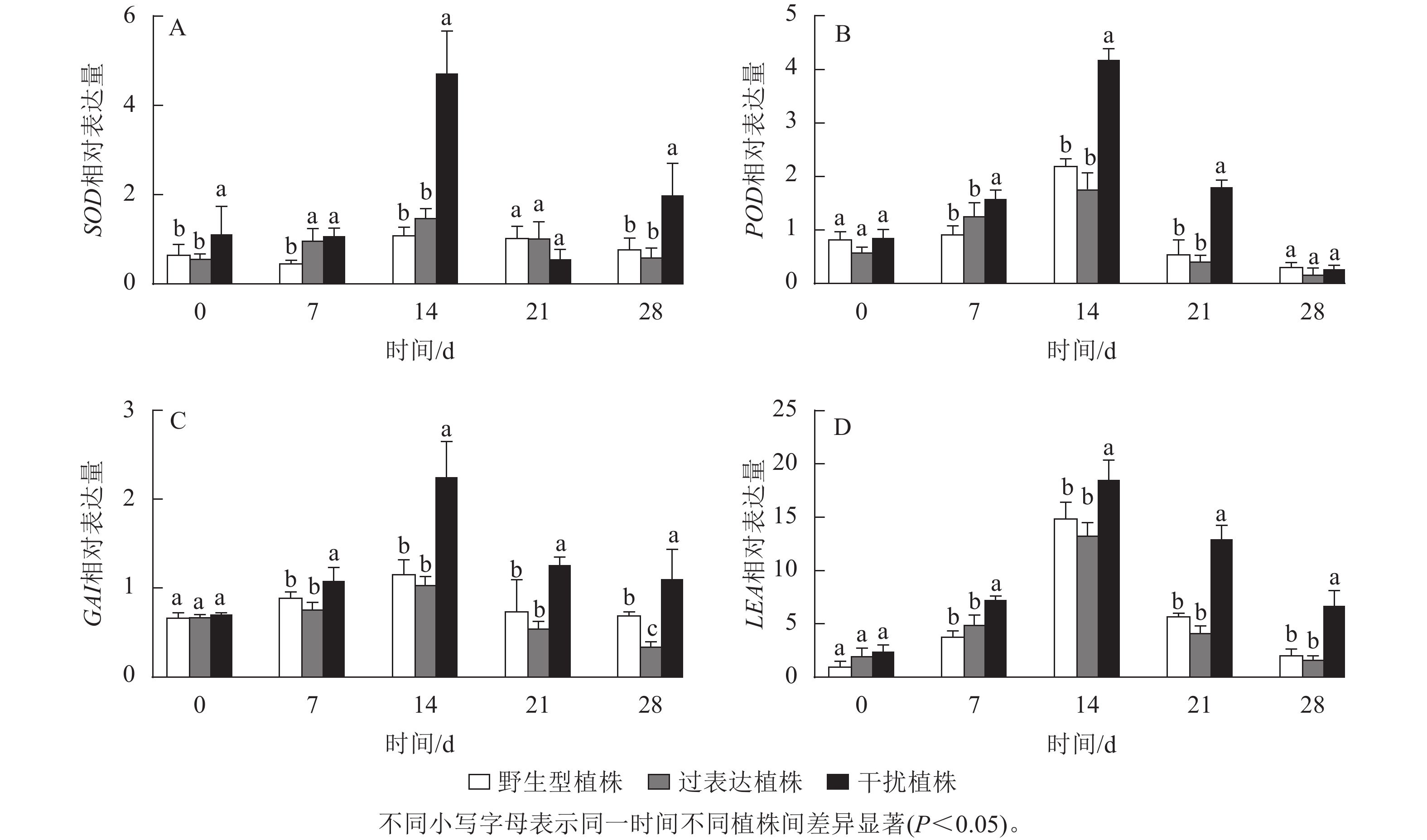 • 选取干旱胁迫 0~14 d的野生型植株、过表达植株、干扰植株叶片进行氯化硝基氮蓝四唑(NBT)及3, 3-二氨基联苯胺(DAB)化学染色分析,方法参照文献[12]。设置3次生物学重复,每组3株。