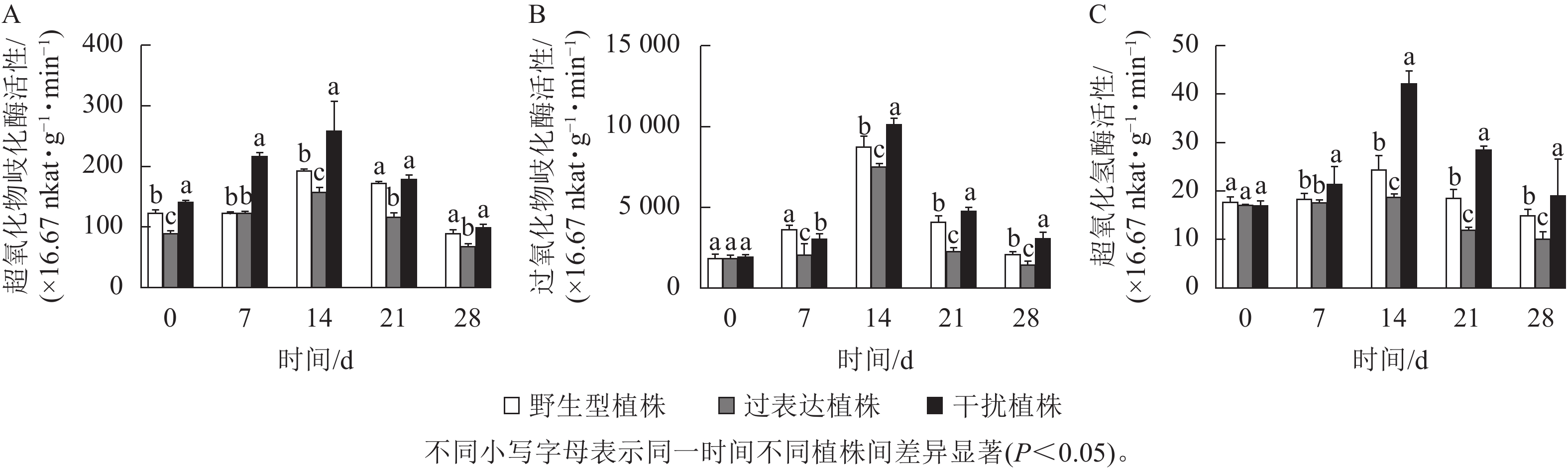 在干旱胁迫下,植物通过控制气孔开闭调控叶片的蒸腾速率[19]。植物受到胁迫时会促进气孔关闭,减慢蒸腾速率,保持植株含水量。本研究对3种植株干旱胁迫时气孔开度进行测定,结果表明:干扰植株气孔开度显著低于野生型植株,这与小麦Triticum aestivum[20]、银腺杨Populus alba ‘Berolinensis’[21]和油茶Camelia oleifera[22]在受到干旱胁迫时的气孔变化一致,表明较低气孔开度的植株具有较强的耐旱性。研究表明:叶绿素质量分数直接影响植株光合作用[23]。在干旱环境中叶绿素质量分数稳定可以增强植株适应干旱的能力[24]。本研究中,3种植株的叶绿素质量分数随干旱胁迫时间的增加都出现了降低态势,其中干扰植株的叶绿素质量分数始终显著高于其他2种植株,说明干扰植株的叶绿素质量分数较稳定,该植株的抗旱能力较强。植物在非生物胁迫时过量积累活性氧,产生氧化胁迫反应,此时机体通过引起酶系统(超氧化物歧化酶、过氧化物歧化酶、过氧化氢酶)和非酶物质的增多来清除多余的活性氧,维持植株稳定性[25]。本研究检测结果表明:随着干旱胁迫持续时间的增长,过表达植株的活性氧物质增加明显超过野生型植株,说明过表达植株在干旱胁迫中更易受到伤害,产生较多的活性物质;而抗氧化酶活性随着干旱时间延长,整体呈现先上升后下降的趋势,且干扰植株体内的抗氧化酶活性始终高于野生型植株,说明干扰植株的抗旱性优于野生型植株。丙二醛质量摩尔浓度是植物遭受逆境时的常用指标。有研究表明:麻栎Quercus acutissima、皂荚Gleditsia sinensis、白蜡Fraxinus chinensis等植物在干旱胁迫下丙二醛质量摩尔浓度均上升,其中麻栎的丙二醛质量摩尔浓度变化更为稳定,变化幅度较小,说明麻栎相比皂荚、白蜡,具有更好的抗旱性[26]。本研究发现随着胁迫时间的增加,3种植株的丙二醛质量摩尔浓度均呈现上升趋势,其中干扰植株较为稳定,与前人研究结果一致,因此,推测干扰植株抗旱性较强。