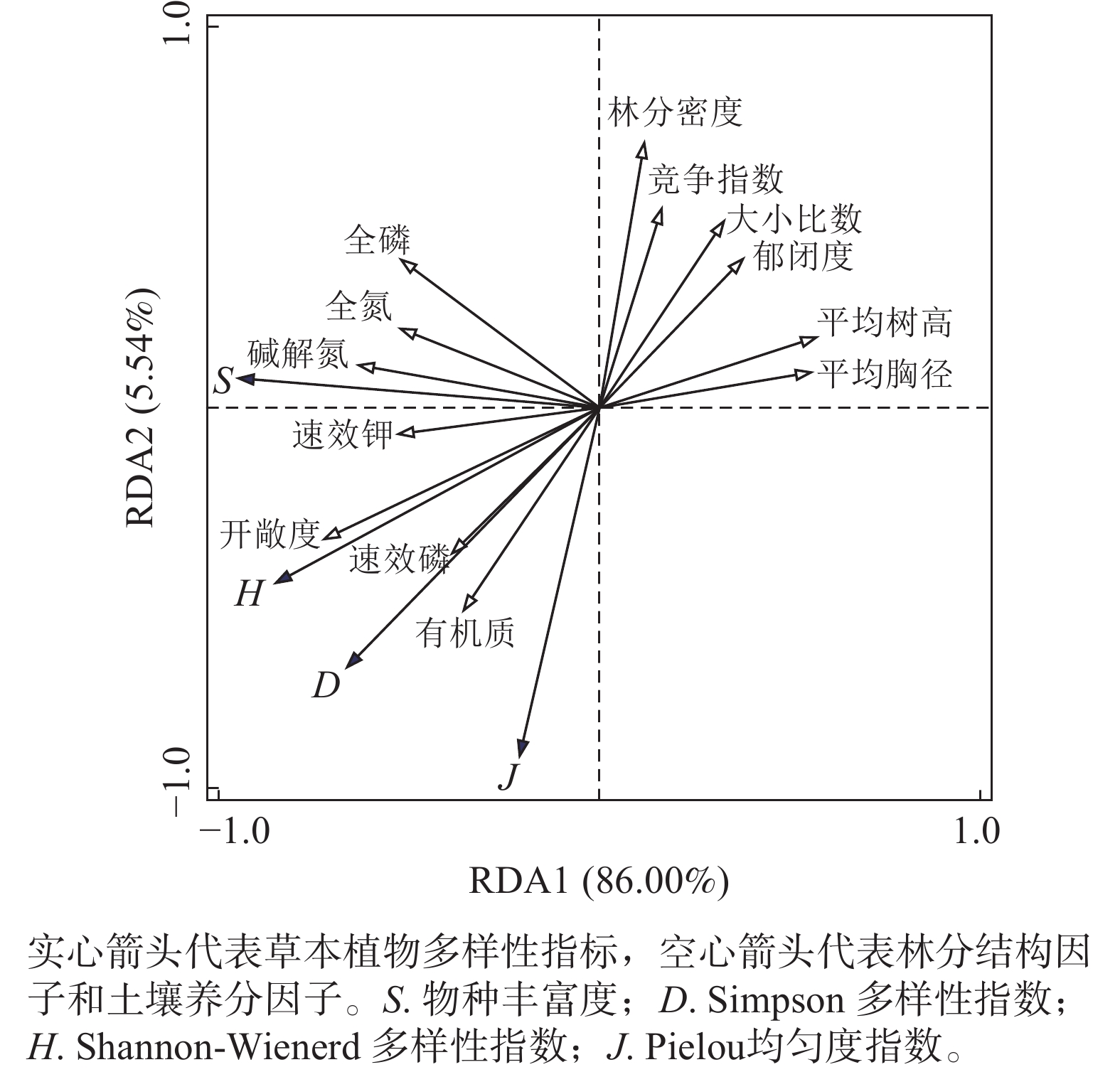 图 2 林分结构因子、土壤因子与草本植物多样性RDA分析结果