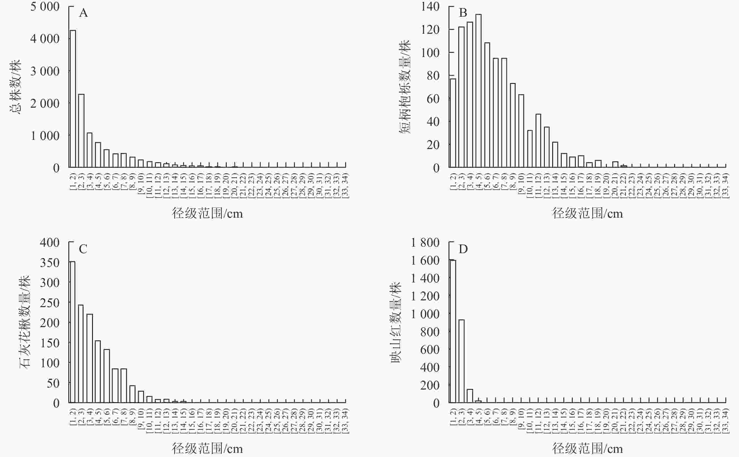 婺城南山样地内群落径级结构整体呈倒“J”型(图3A),最大的胸径数值为32.3 cm,该物种为杉木。物种数量在1~6 cm的胸径区间内存在较大程度的下降,但整体上并未出现明显的断层。3种优势物种中,短柄枹栎(图3B)和石灰花楸(图3C)在不同径级结构中都比较常见,97.80%的映山红胸径在3.5 cm以下(图3D)。短柄枹栎和石灰花楸在样地中表现出小乔木的特征,在群落中幼苗或幼树的储备量比较充足,较小或较大径级的植株都比较充裕,映山红则表现出灌木的性状,较大径级植株数量较少。
