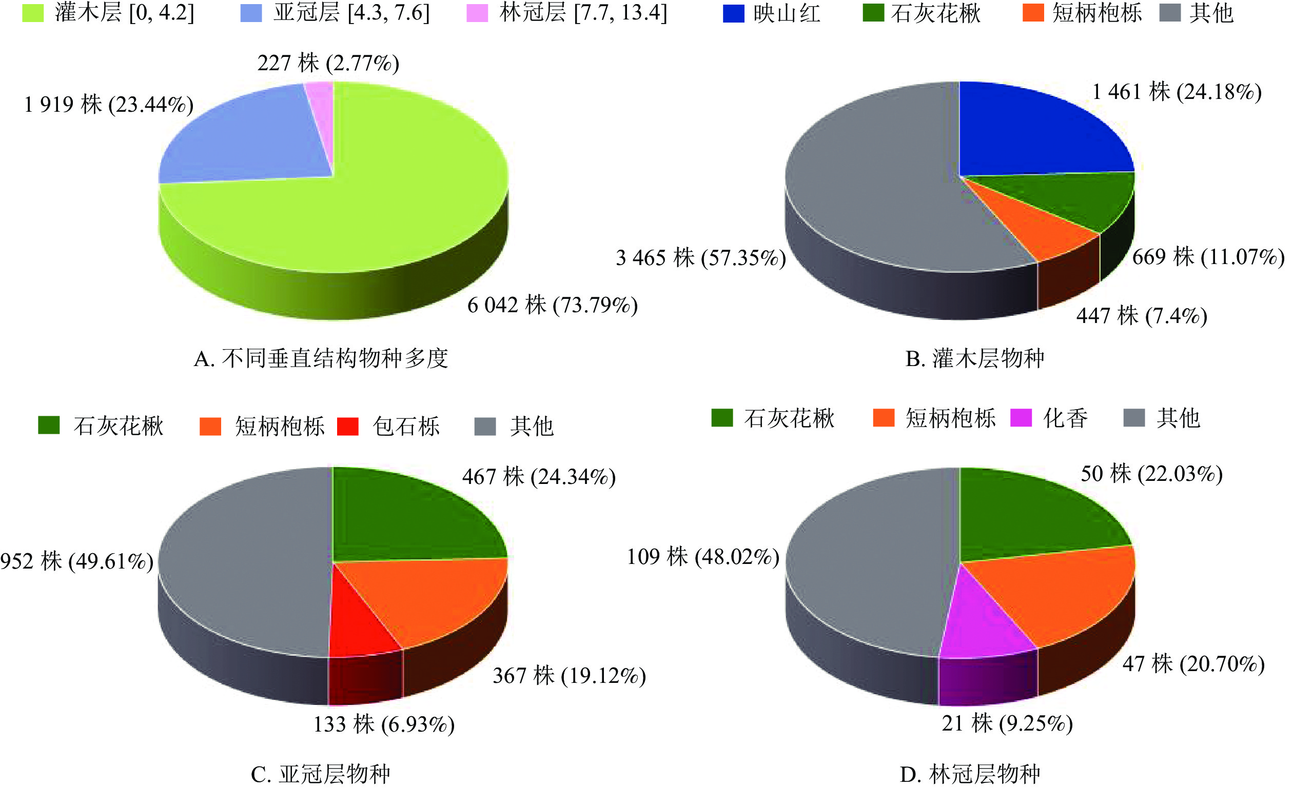 排除受地形或外力因素导致倾斜角度过大或倒伏的木本植物,用于垂直结构分析的植物共8 188株。婺城南山样地中树高范围在灌木层的植物有6 042株(73.79%),其中,映山红、石灰花楸和短柄枹栎的数目较多,分别占该区间植物数的24.18%、11.07%和7.40%(图4A和图4B)。婺城南山样地中树高范围在亚冠层的植物有1 919株(23.44%),其中,石灰花楸、短柄枹栎和包石栎分别占所在林层植株数量的24.34%、19.12%和6.93%,在亚冠层中数量较多(图4A和图4C)。处于林冠层的植物总计227株(2.77%),植株总数相对较少,其中,石灰花楸、短柄枹栎和化香3种落叶树种分别占所在林层植株数量的22.03%、20.70%和9.25%(图4A和图4D)。