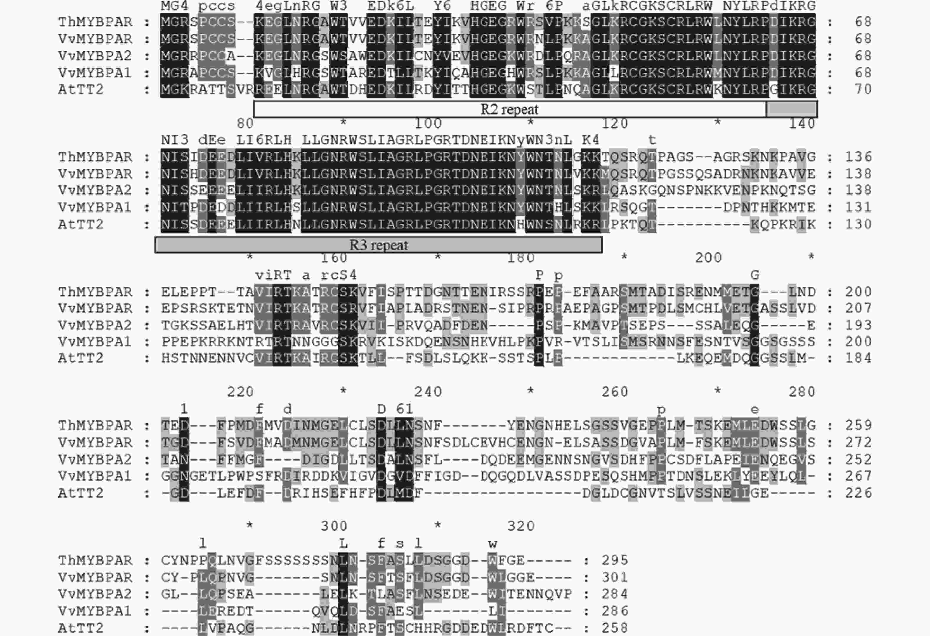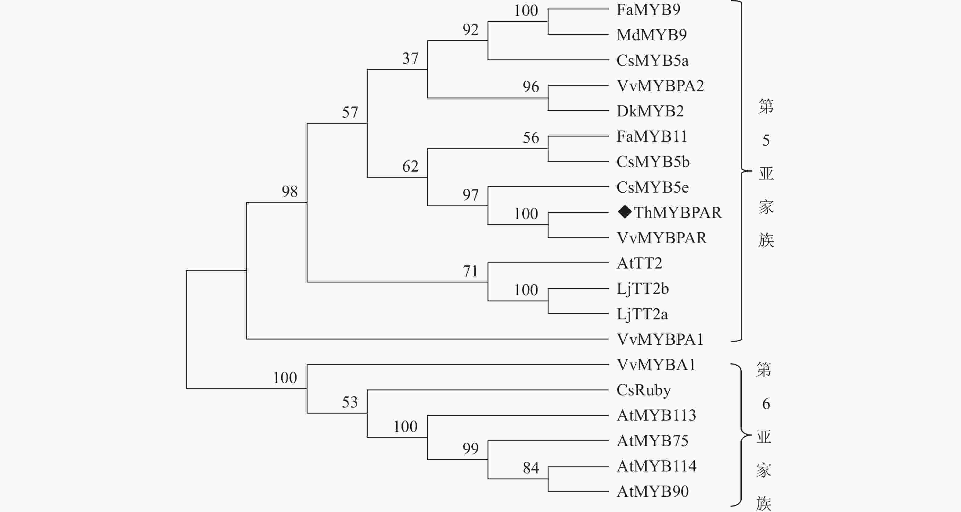 本研究发现了1个属于R2R3-MYB第5亚家族的MYB转录因子,命名为ThMYBPAR。ThMYBPAR基因的序列长度为888 bp,预测编码产生310个氨基酸组成的蛋白。将ThMYBPAR蛋白与美国国家生物技术信息中心(NCBI)数据库中收录的VvMYBPAR、VvMYBPA1、VvMMYBPA2和AtTT2进行序列比对(图2),结果发现ThMYBPAR具有典型的R2和R3 DNA结合功能结构域,说明ThMYBPAR为R2R3-MYB家族。且本研究进一步分析了ThMYBPAR与数据库中的VvMYBPAR、VvMYBPA1、VvMMYBPA2和AtTT2序列上的差异。从系统进化分析结果(图3)可以明显看出:ThMYBPAR可以与VvMYBPAR、CsMYB5e、CsMYB5b等R2R3-MYB第5亚家族的成员聚为一类,且ThMYBPAR与VvMYBPAR更相近。