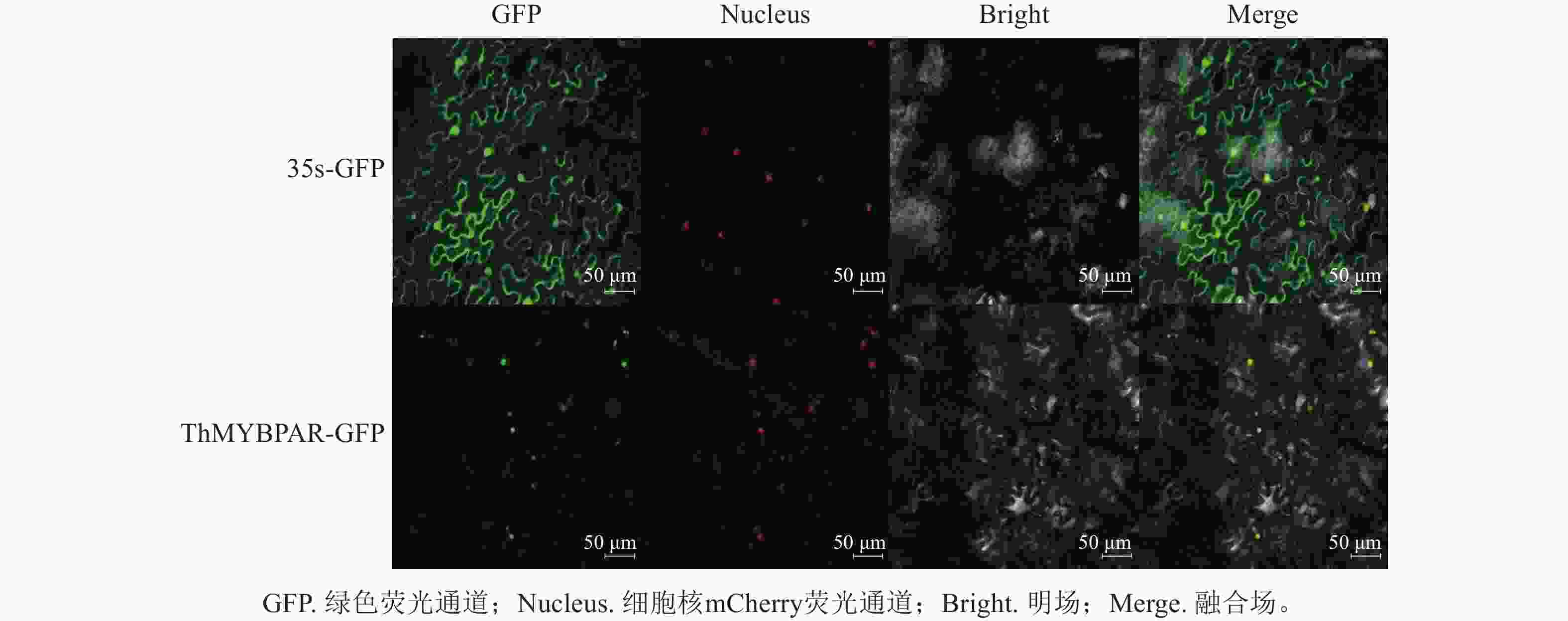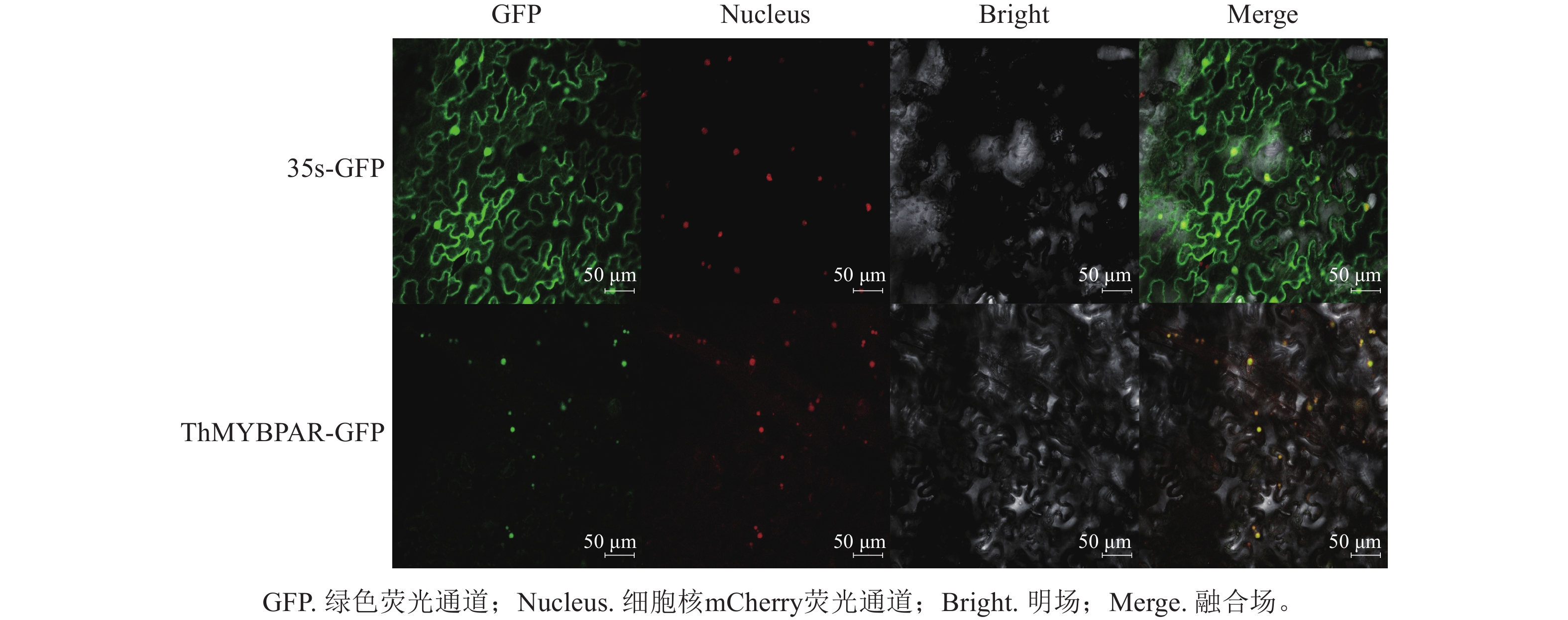 蛋白质在细胞中的定位一定程度上能够反映其潜在的功能,为了探究ThMYBPAR编码蛋白在细胞中的定位,构建基因ThMYBPAR与GFP融合表达载体,与植物细胞核定位Marker在烟草叶片中共定位。如图4所示:ThMYBPAR蛋白的荧光信号仅出现在烟草的细胞核中,呈现出明显的绿色荧光信号,与植物细胞核定位Marker定位一致,说明ThMYBPAR属于核定位。