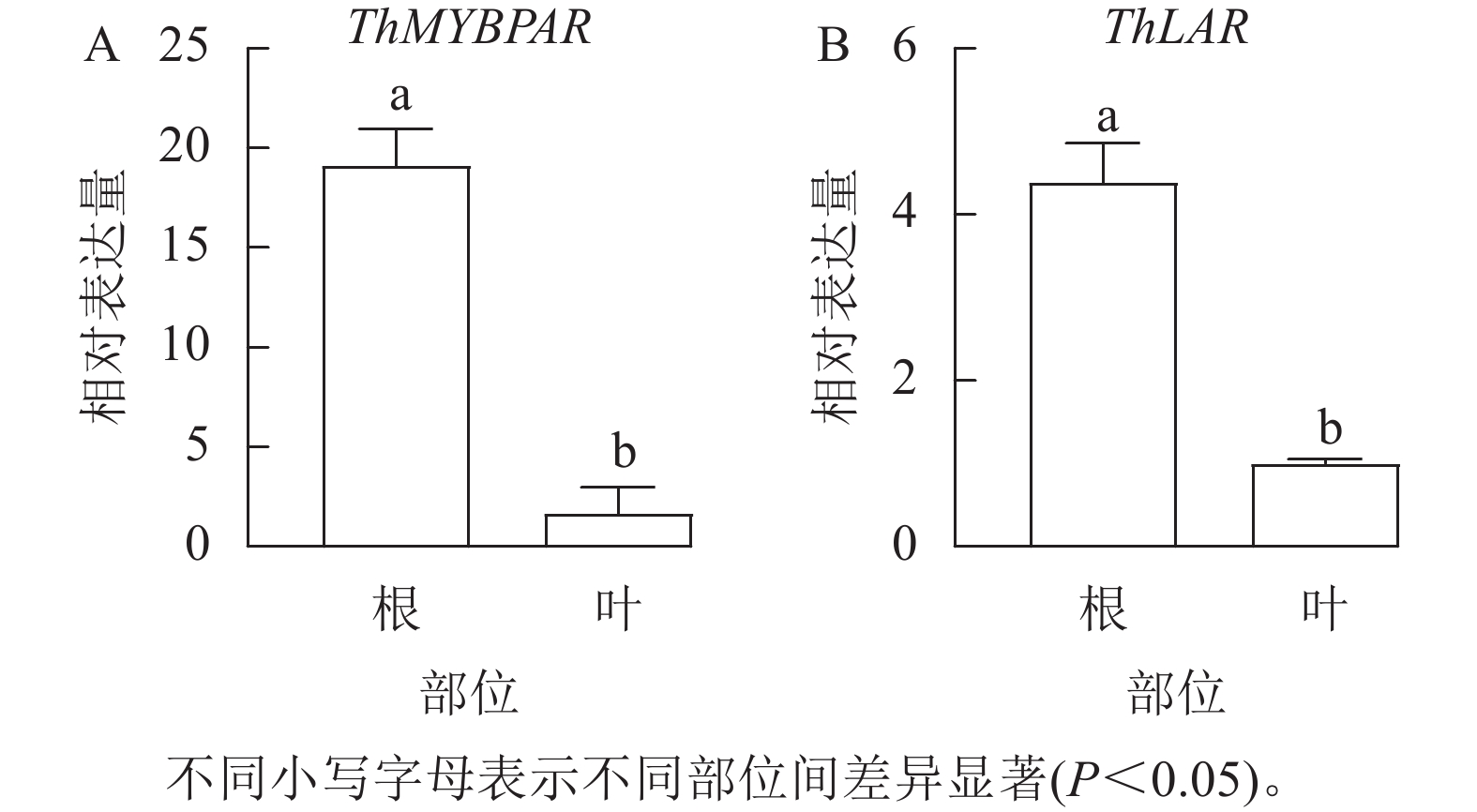 对ThMYBPAR及ThLAR基因进行RT-qPCR验证(图5)显示:块根中ThMYBPAR及ThLAR表达量显著高于叶片(P<0.05)。其中三叶青块根中ThLAR的表达量是叶片中的4倍,而块根中ThMYBPAR的表达量是叶片的20倍。