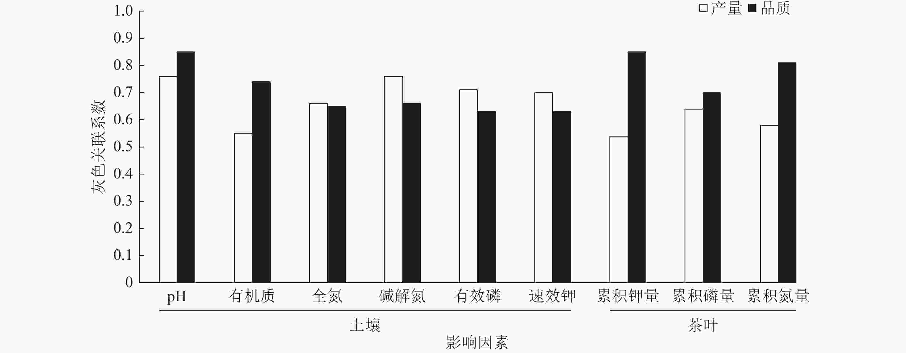 分别以茶叶产量和品质作为“参考值”,以潜在影响因素作为“子序列”进行灰色关联度分析,结果如图2所示。从图2可知:茶叶产量与土壤pH、碱解氮和有效磷的关联程度最高,关联系数均大于0.70。其次为土壤速效钾、全氮和茶叶磷质量分数,与产量的关联系数为0.64~0.70,而土壤有机质及茶叶氮、茶叶钾质量分数与产量的相关性较低,关联系数为0.54~ 0.58。土壤pH、茶叶钾、茶叶氮质量分数对茶叶品质影响最大,灰色关联系数大于0.81;其次为土壤有机质和茶叶磷质量分数,灰色关联系数为0.70~0.74。由此可知,影响茶叶产量和品质的关键因素不同,供试茶园土壤pH、碱解氮和有效磷是影响茶叶产量关键因素,而茶叶品质与土壤pH、茶叶钾和氮质量分数的关系更紧密。