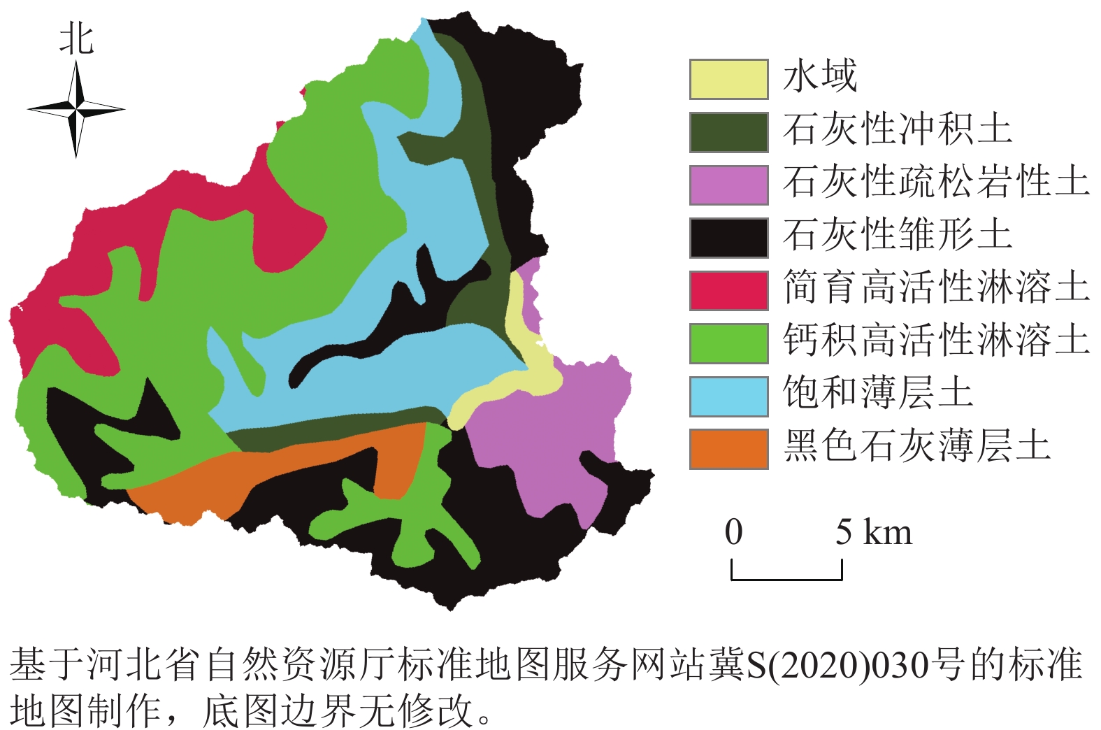 • 从世界土壤数据库(HWSD)的中国土壤数据集(v1.1)中选用本研究的土壤数据。流域内土壤类型有:石灰性雏形土(calcaric cambisols)、钙积高活性淋溶土(calcaric luvisols)、饱和薄层土(eutric leptosols)、黑色石灰薄层土(rendzic leptosols)、石灰性疏松岩性土(calcaric regosols)、石灰性冲积土(calcaric fluvisols)、简育高活性淋溶土(haplic luvisols)。
