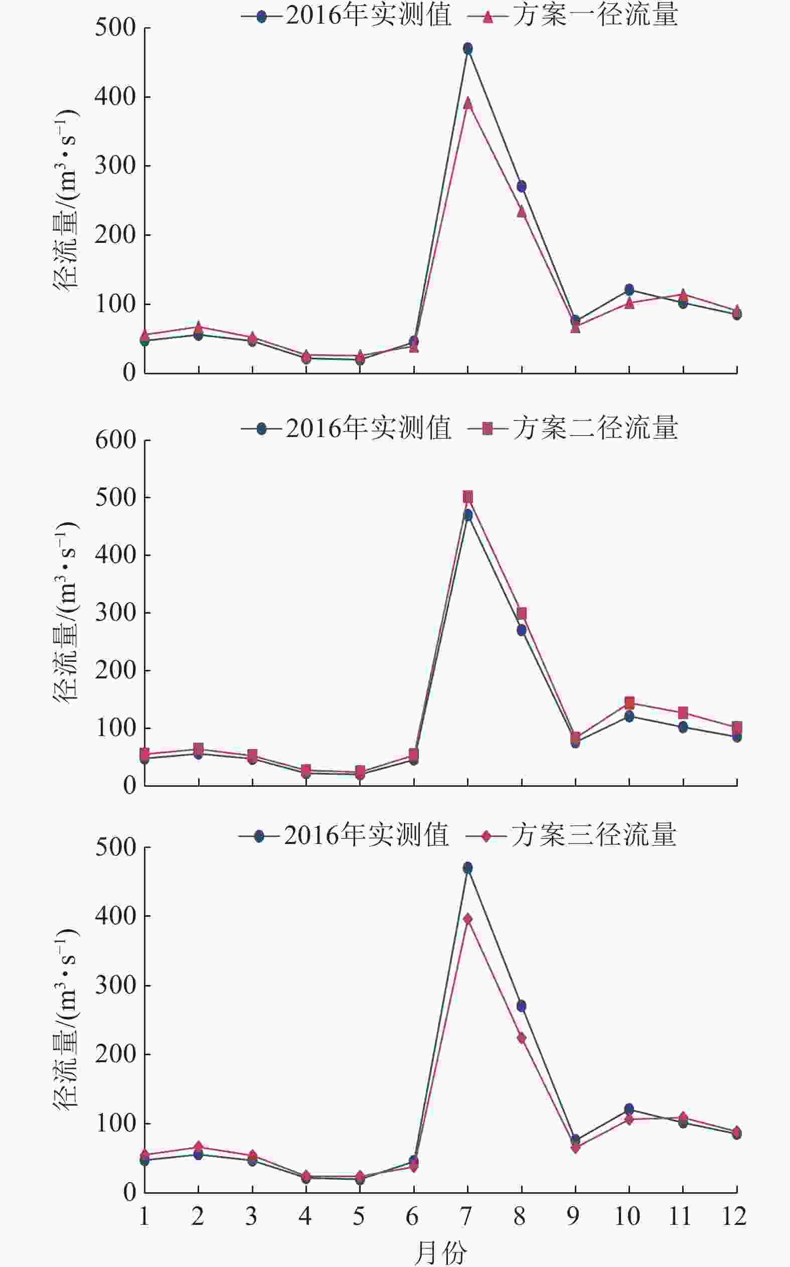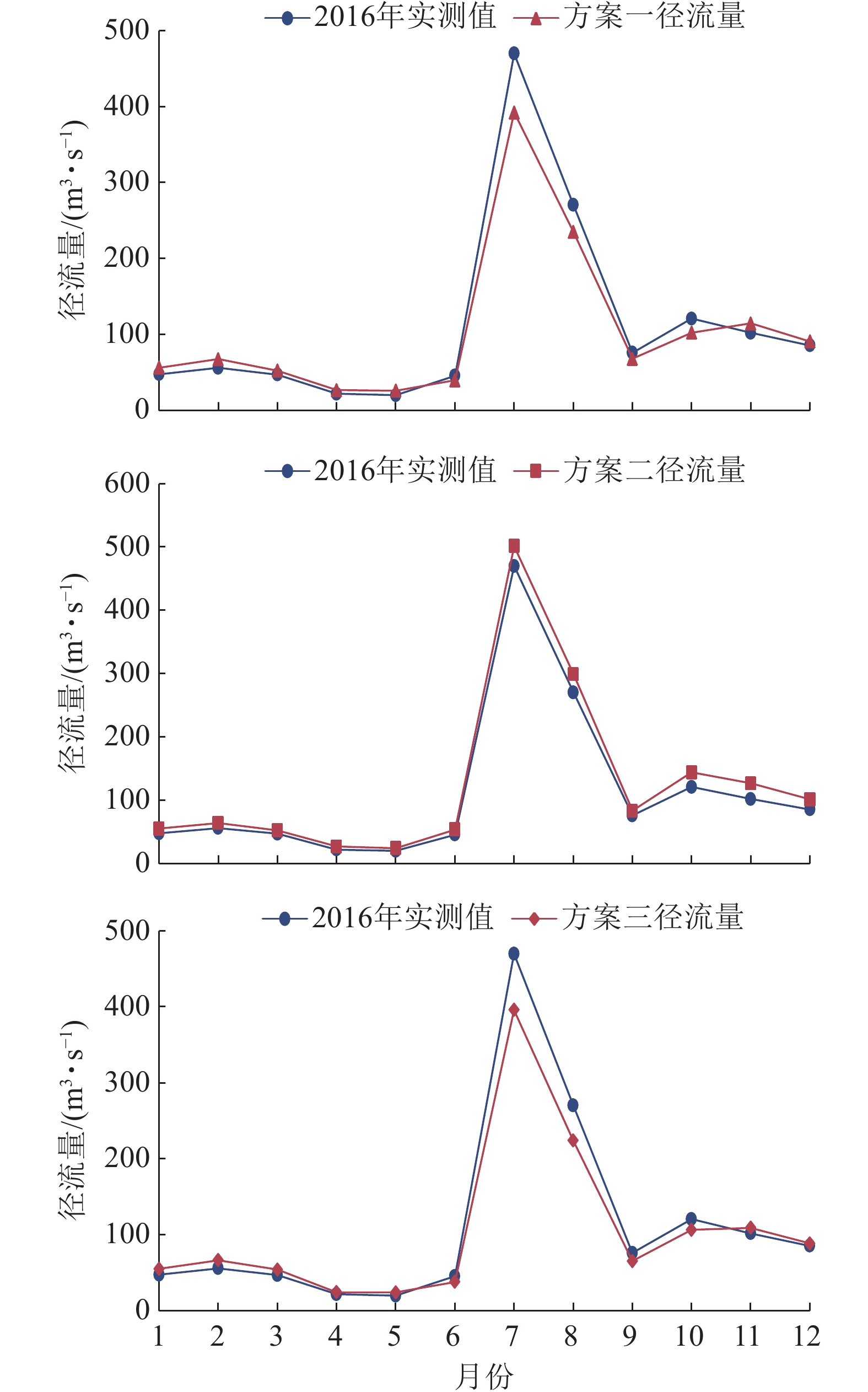 图4可以看出:本研究提出3种空间配置情景方案与2016年实测结果基本一致,丰水期均为6—9月,枯水期为1—4月,最大月平均径流量出现在7月,与降雨量呈正相关关系。3种空间配置情景方案下的径流量变化与实测值均呈极显著正相关(P<0.01),且变化趋势一致。2016年实测平均径流量为113.48 m3·s−1,丰水期月平均径流量为215.41 m3·s−1,枯水期月平均径流量为43.03 m3·s−1