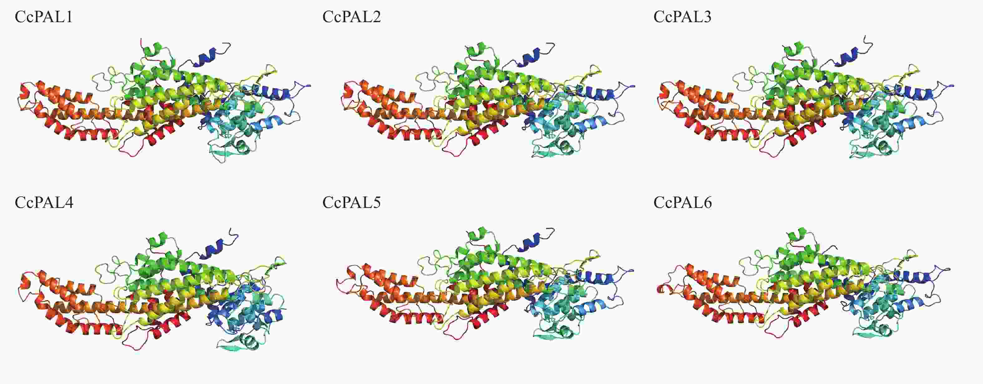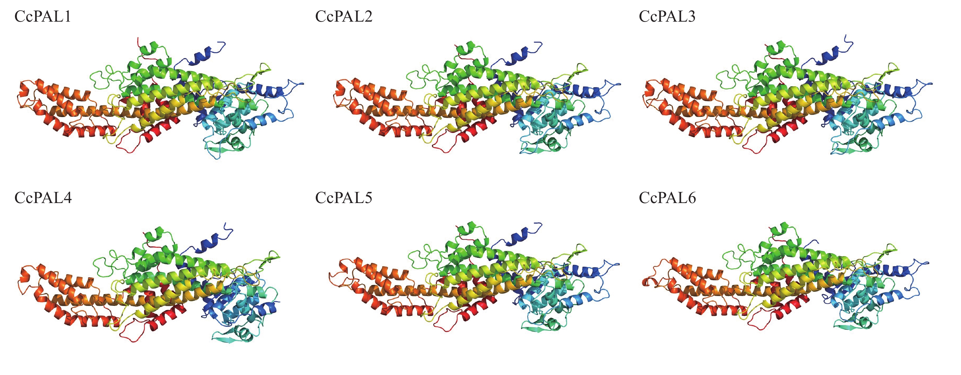 对CcPALs的6个蛋白进行二级结构和三级结构预测分析发现:α-螺旋与无规则卷曲在二级结构中占比较高。其中CcPAL4的α-螺旋占比最高(56.48%),CcPAL5的延伸链结构、β-转角占比最高(9.13%、6.88%);CcPAL6的无规则卷曲占比最高(33.29%)(表4)。进一步对6个CcPAL蛋白进行了三级结构模型预测(图1),结果显示编码蛋白三级结构主要以α-螺旋为主要结构元件。