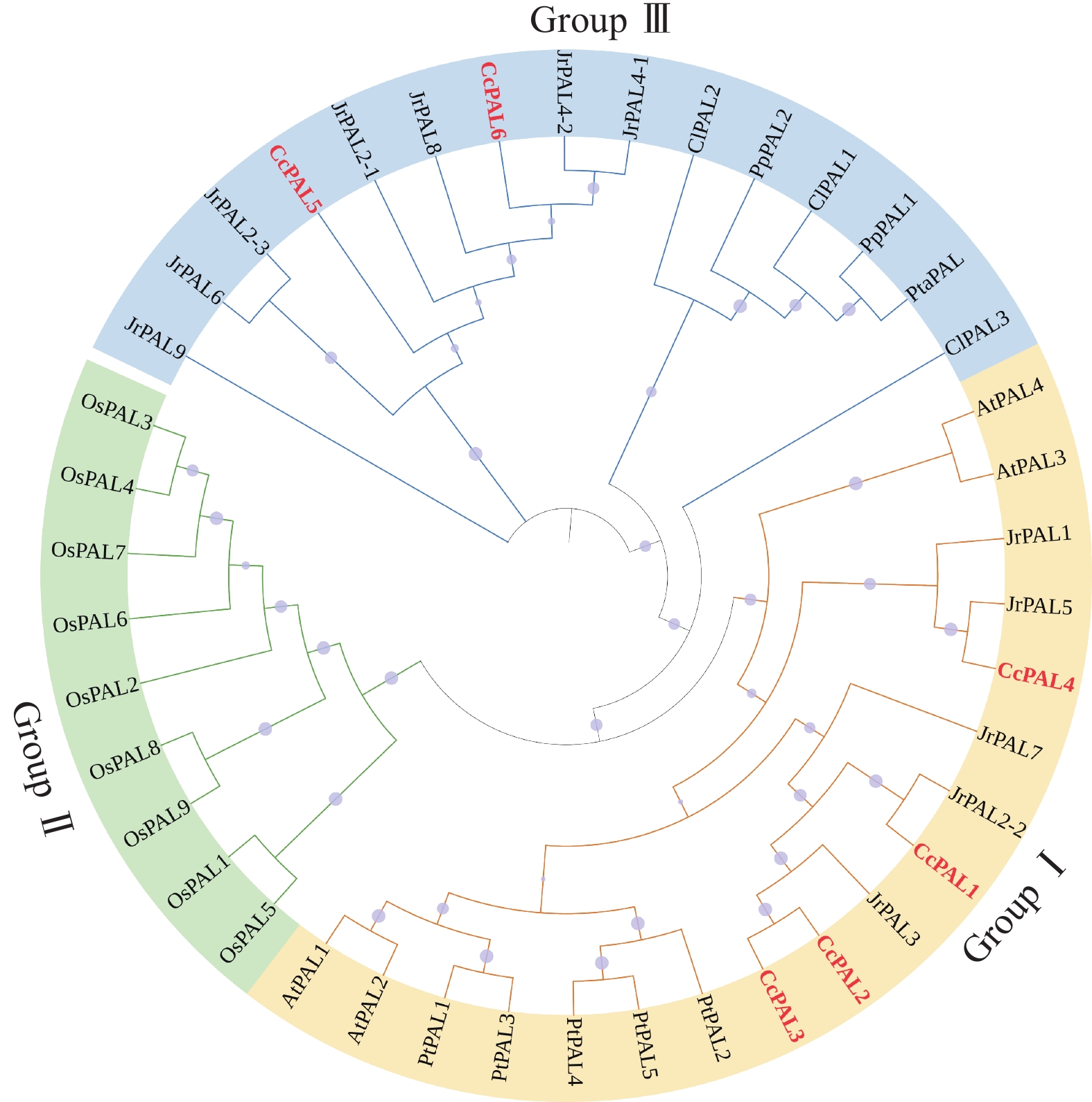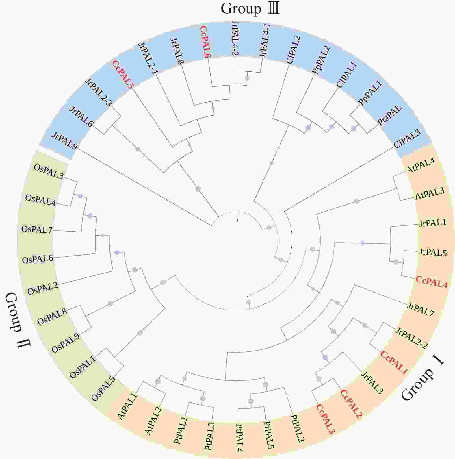 基因复制是进化创新和功能分化的主要机制[32]。核桃中存在12个PAL基因,彼此间蛋白结构差异较大,部分功能结构域缺失;而山核桃中存在6个PAL基因,成员间氨基酸数量相当,结构较为完整,存在个别氨基酸突变,说明PAL在核桃中发生了重大的变异和较多的基因复制活动,在山核桃中PAL更为保守。裸子植物的PAL基因亚群与被子植物的亚群是姐妹群,这可能意味着这些基因编码的PAL同工酶具有相似的功能,或者受到相似的发育调控机制的调控[8]。根据已测序物种的基因序列构建包含裸子植物、单子叶植物和双子叶植物的PAL系统发育树,结果显示:CcPAL5、CcPAL6和裸子植物PAL聚在一起,而CcPAL1~CcPAL4和双子叶植物聚在一起且具有高自展值,说明CcPAL5、CcPAL6与CcPAL1~CcPAL4可能有不同的进化起源。其他PAL基因在双子叶植物和单子叶植物分化后呈单系,表明基因复制在双子叶植物和单子叶植物分化后PAL基因的进化中很重要[3335]