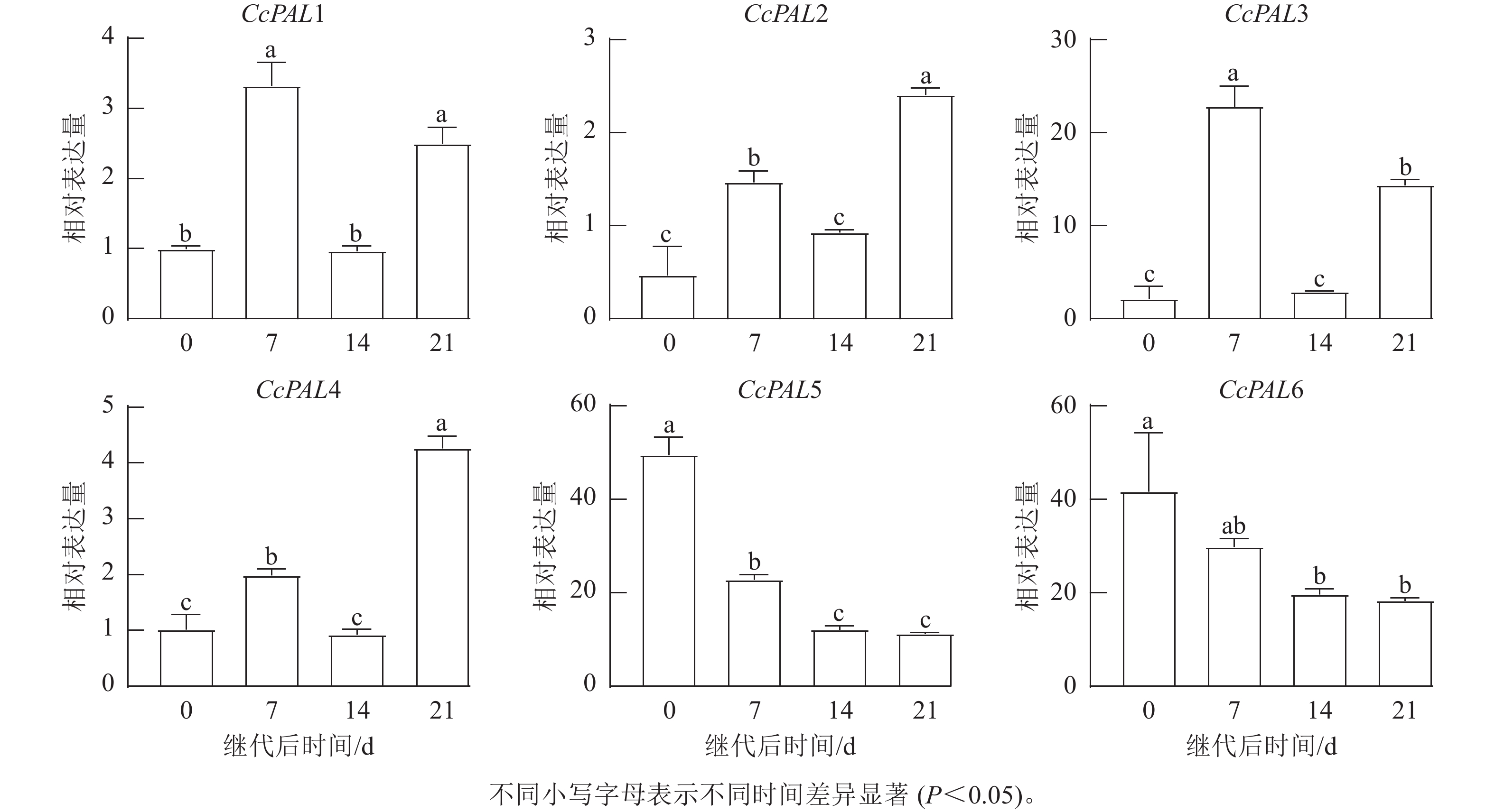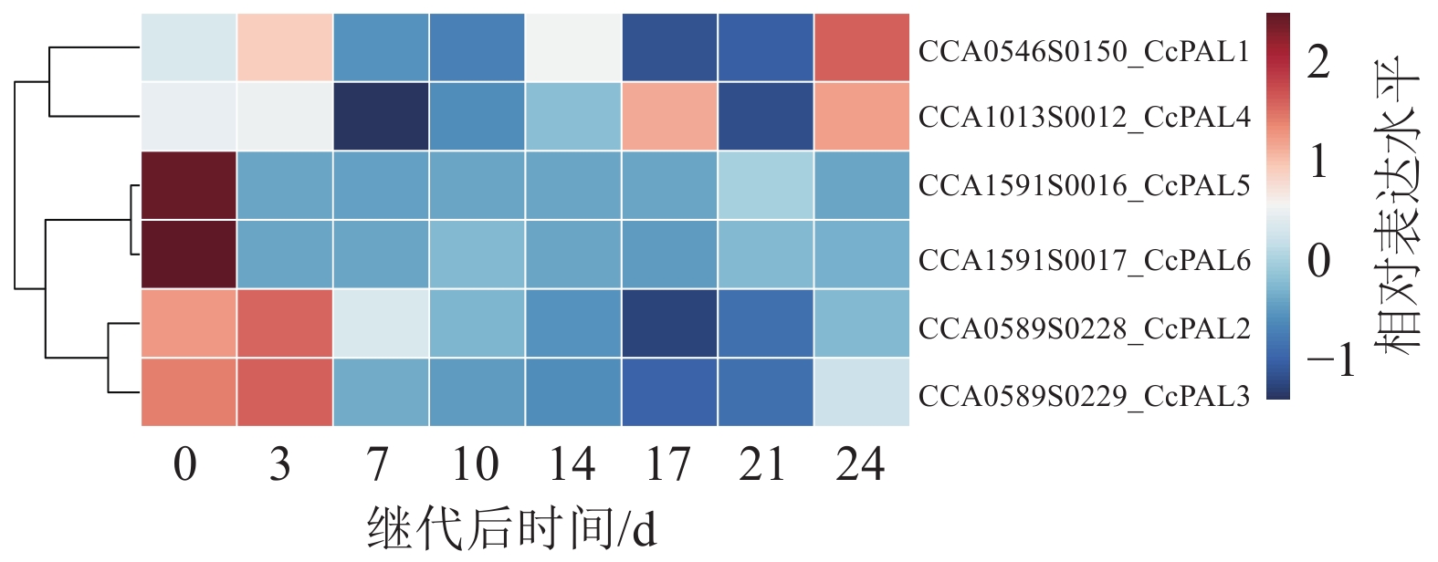 CcPALs基因在不同时间的愈伤组织中均有表达,但不同基因的表达量不相同。CcPAL5和CcPAL6整体表达量较高,且在继代后0 d表达量最高,说明继代后愈伤组织受伤期间CcPAL5和CcPAL6已经开始响应表达;CcPAL1~CcPAL4基因在愈伤组织开始增殖(继代后7 d)和出现褐化(继代后21 d)时表达量较高,说明2个不同分支下的PAL基因对山核桃愈伤组织的环境适应和细胞增殖褐化有不同的影响(图7)。