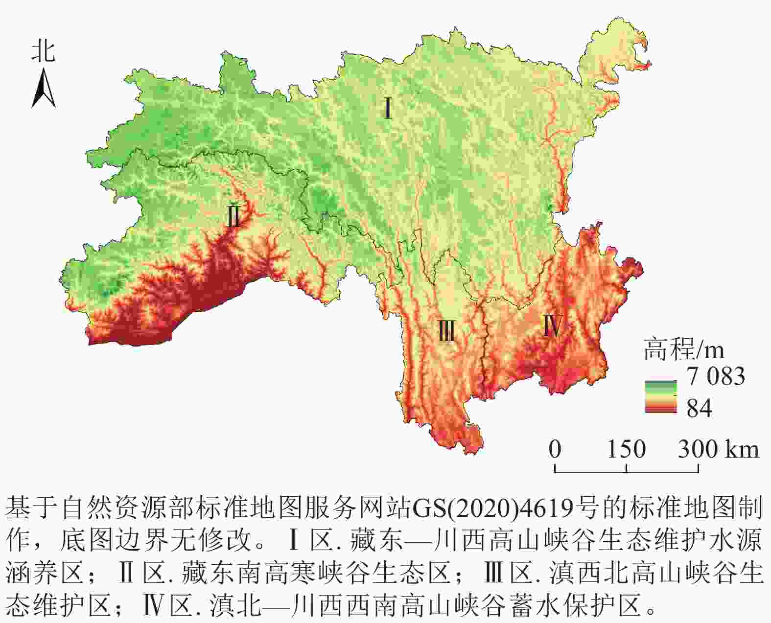 • 西南高山峡谷区地处四川省、云南省和西藏自治区交界地带(24°58′7.47″~32°51′24.93″N,91°23′48.24″~104°13′43.55″E),包含12个地级市、88个县区,面积为60万km2。该区地处大横断“七脉六江”,海拔为84~7 083 m,地形以山脉和高原为主,分为藏东—川西高山峡谷生态维护水源涵养区(Ⅰ)、藏东南高寒峡谷生态区(Ⅱ)、滇西北高山峡谷生态维护区(Ⅲ)、滇北—川西西南高山峡谷蓄水保护区(Ⅳ)(图1)。气候属于亚热带季风气候和高原山地气候,气温为−3~22 ℃,降水量为296~2 302 mm,雨季较集中,土壤和植被类型丰富。西南高山峡谷区少数民族聚集,种植模式各具特色,规模化种植下集约化程度高,经果林水土流失等问题突出,限制了生态产业的可持续发展。由于特殊地形、地质和气候条件,区域内生态环境脆弱,属于国家生态环境重点保护区域。