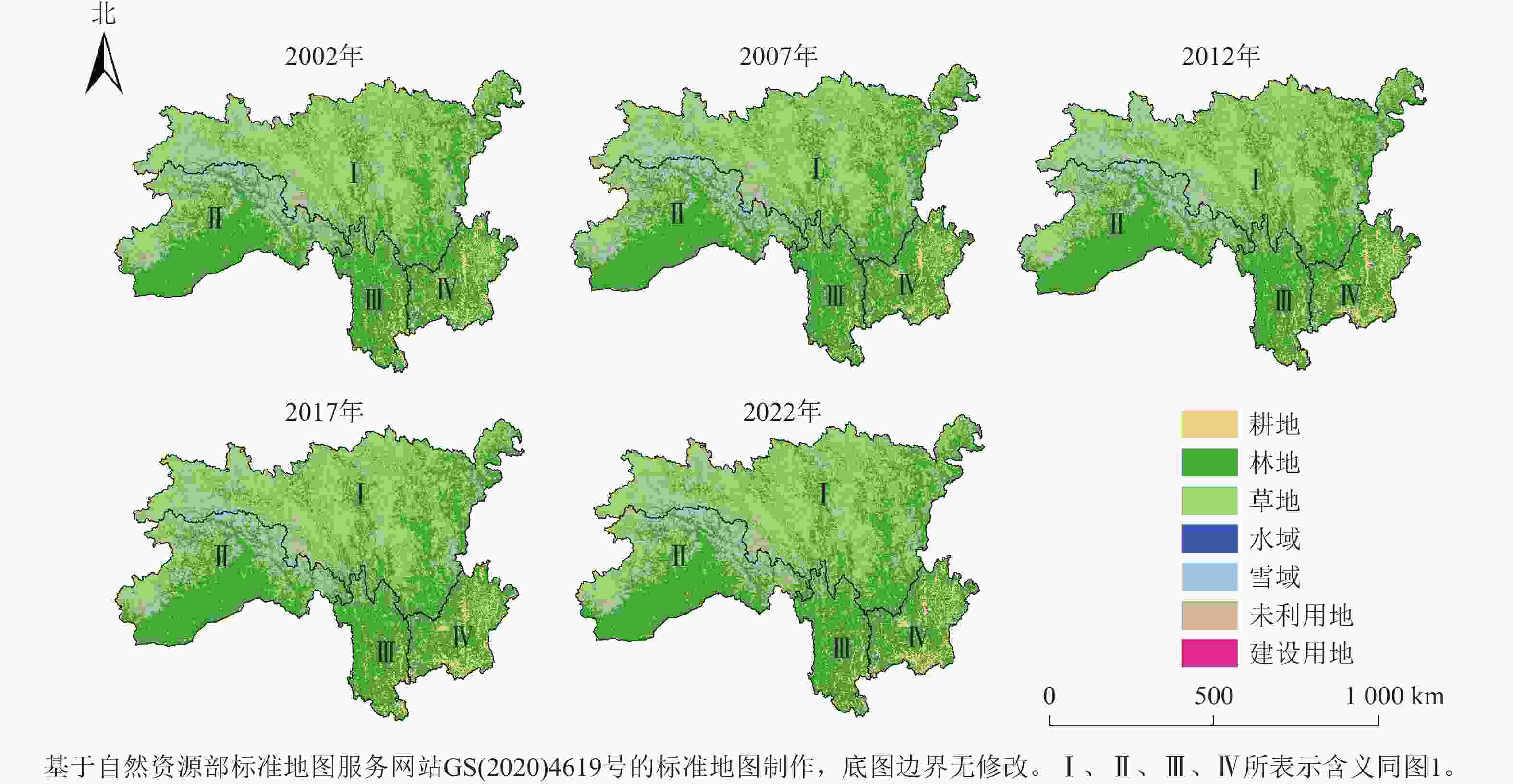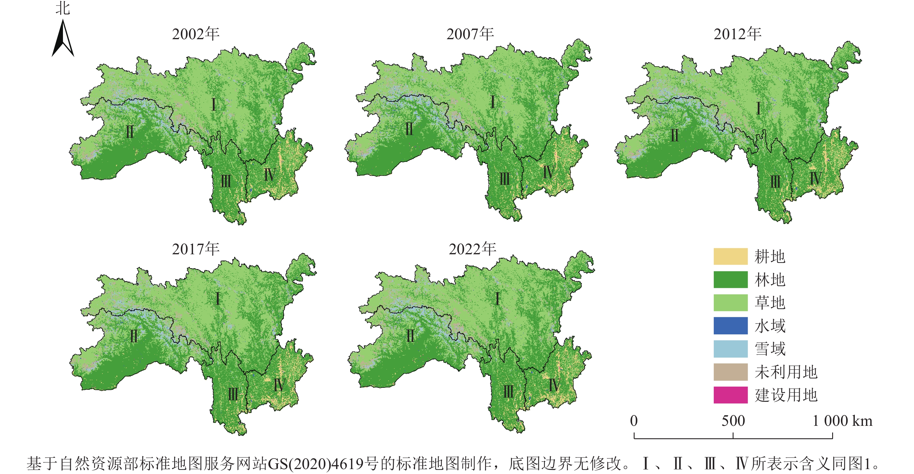 Figure 2.Changes of land use types in southwest alpine canyon region from 2002 to 2022