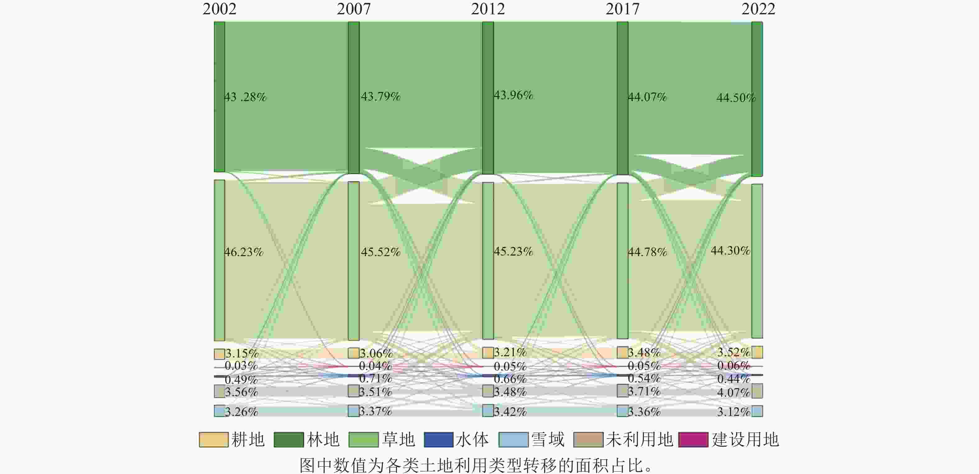 • 根据中国土地覆盖数据集(CLCD),将研究区划分为耕地、林地、草地、水域、雪域、建设用地和未利用地等7类,并通过土地利用转移矩阵定量反映研究区5期(2002、2007、2012、2017、2022年)不同土地利用类型间的相互转换情况。土地利用转移矩阵不仅包含研究初期和末期的土地利用信息,也反映研究时段内各土地利用类型面积转入与转出的详细信息[20]