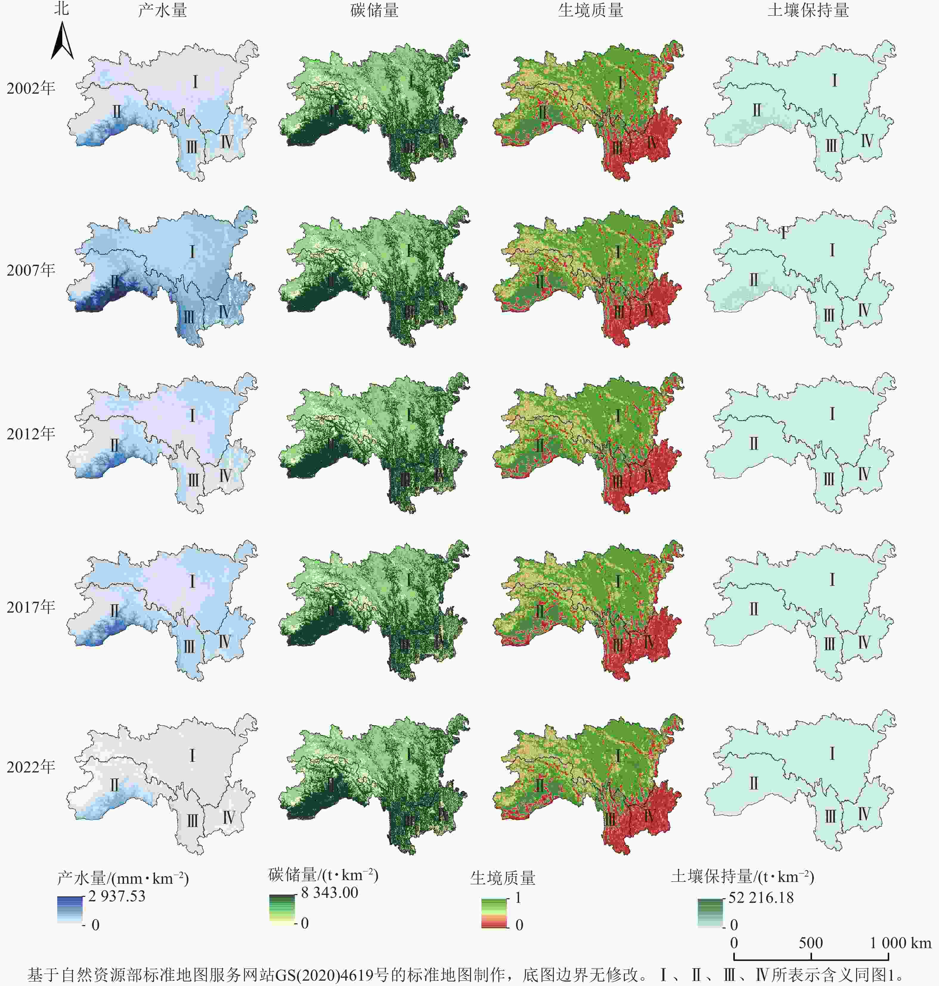 • 图4可以看出:2002—2022年,西南高山峡谷区产水量平均值呈先降低后增加再降低的趋势。产水量高的Ⅱ区以林地、水域和雪域为主,地势较高,受人类活动影响较小;产水量低的区域主要分布在Ⅰ区和Ⅳ区,土地类型以草地为主,有相对较多的建设用地和耕地,受人类活动的影响导致产水量较低。碳储量平均值为5 241.55~5 282.36 t·km−2,空间分布上与土地利用类型保持较高的一致性,林地碳储量较高,建设用地和未利用地的碳储量较低。生境质量平均值为0.59~0.62 t·km−2,呈先增加后降低的趋势,生境质量低值和高值区域较多。高生境质量Ⅰ区和Ⅱ区内的草地和林地,对于提升生境质量具有很大的作用。低生境质量的Ⅲ区和Ⅳ区受建设用地和未利用地影响,人类活动频繁,对生境质量产生较大的破坏作用,整体范围内生境质量较低。土壤保持量平均值呈先少量增加后大幅度波动降低的趋势,土壤保持量受降水的影响,降水增加会导致土壤侵蚀强度加剧。在土壤保持量减少最多的2个区域中,Ⅱ区主要受未利用地的影响;Ⅳ区为人口聚集区,建设用地较多,受人类活动干扰,其土壤侵蚀相较其他区域影响更大。