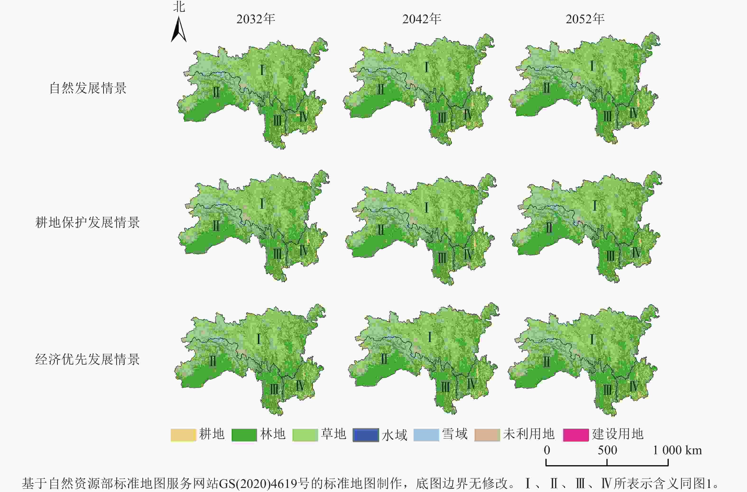 PLUS模型预测下,2032—2052年,自然发展情景下耕地、林地、水域面积增加,草地、雪域、未利用地面积减少;耕地保护发展情景下耕地、草地、水体、未利用地、建设用地面积上升,林地、雪域面积下降;经济优先情景下耕地、林地、水域面积上升,草地、雪域面积下降。