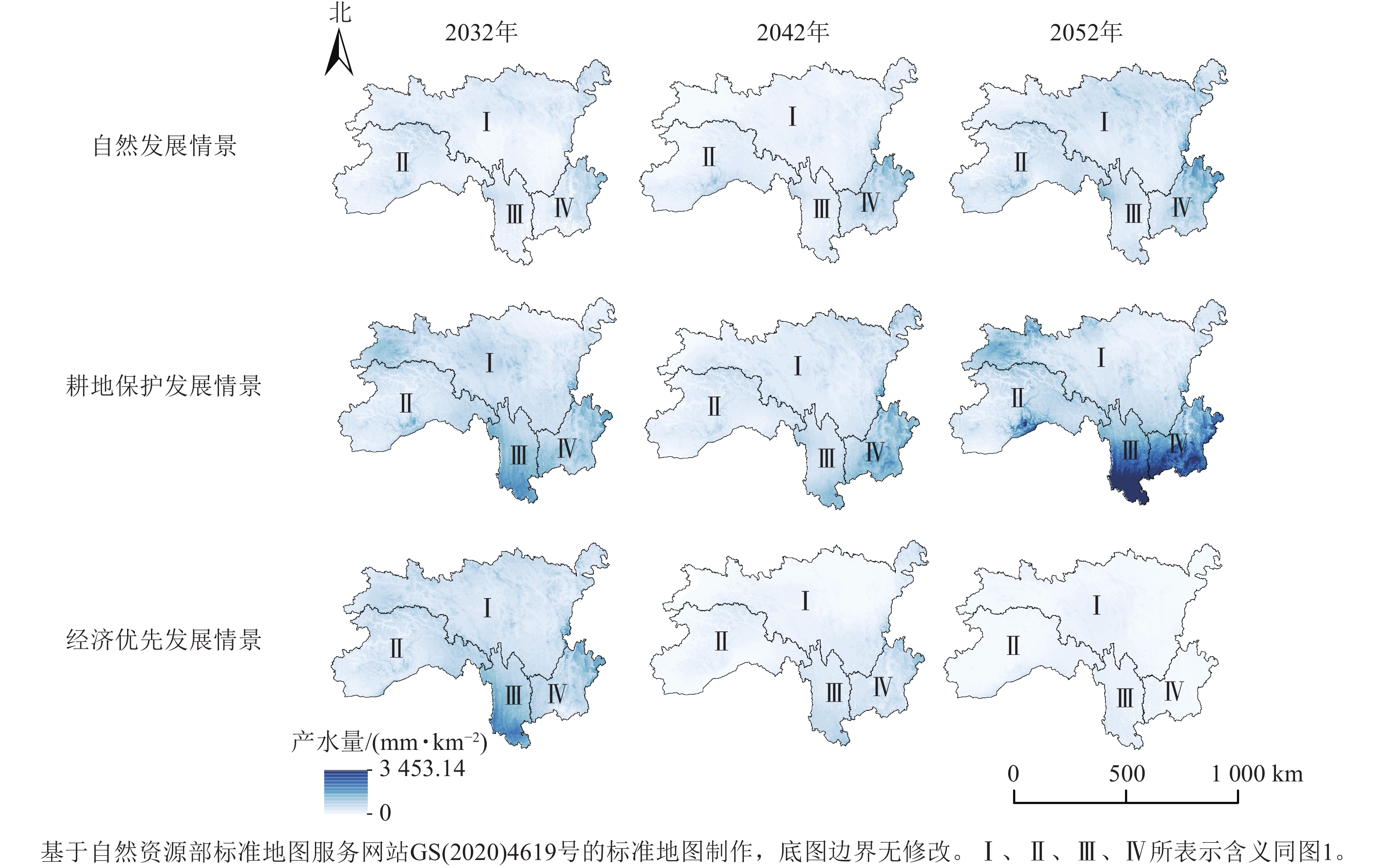 • 从时间上看,西南高山峡谷区年产水量(图6)在2032、2042、2052年自然发展情景下产水量平均值分别为266.75、244.12、488.12 mm·km−2,呈先降低后增加的趋势。耕地保护发展情景下,产水量平均值逐渐降低,但都高于2022年,2032、2042、2052年产水量平均值分别为625.85、471.53、434.34 mm·km−2。经济优先发展情景下,产水量平均值在2032年时高于2022年,后逐渐降低,2032、2042、2052年产水量平均值分别为635.82、205.30、82.71 mm·km−2。从空间分布上看,3种发展情景下年产水量高值都集中分布在Ⅲ区和Ⅳ区,低值主要分布在Ⅰ区。其中自然发展情景下增长较多的区域在Ⅰ区北部和东部、Ⅳ区北部。耕地保护发展情景下4个区域产水量都有所增加。经济优先发展情景下的产水量降低区域主要在Ⅲ区南部和Ⅳ区东北部。